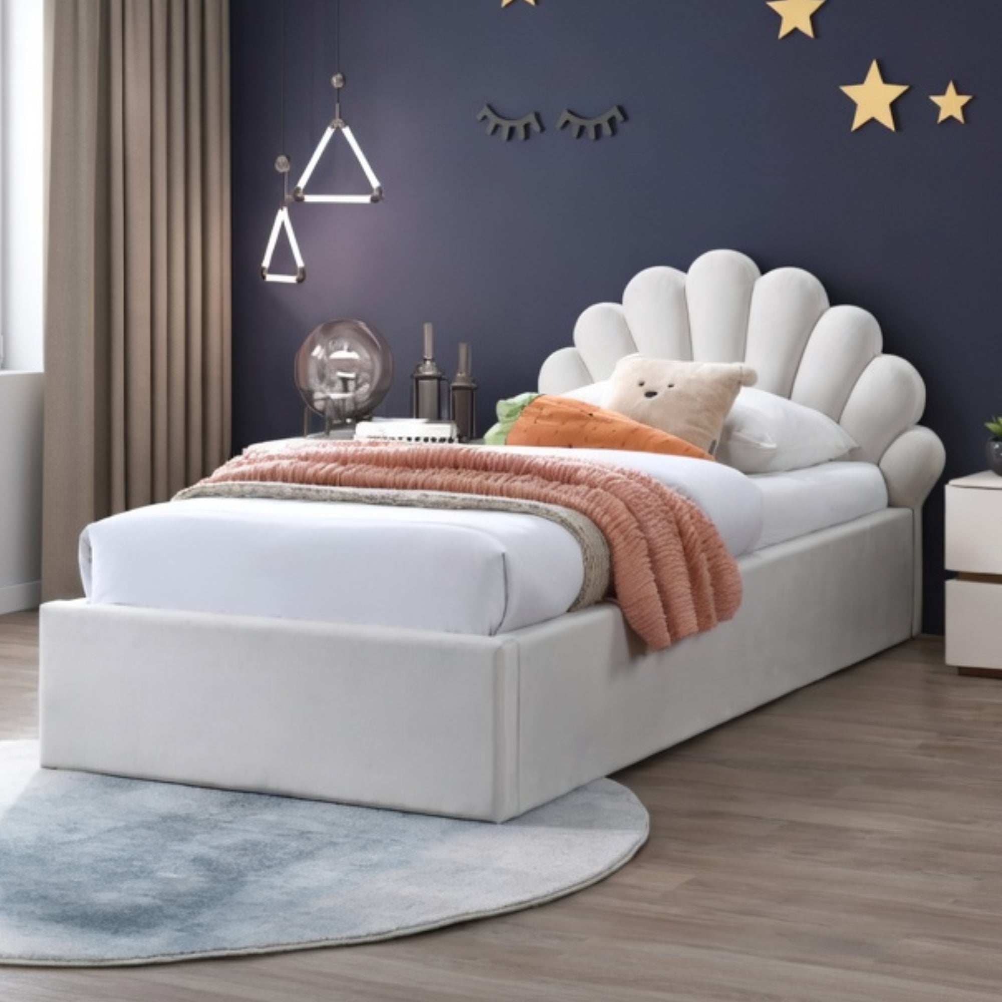 Kids Collective Kinderbett Polsterbett 90x200 cm Kinder Bett Jugendbett mit Lattenrost & Metallrahmen | Kopfteil in Elegantes Muschel-Design | Beige