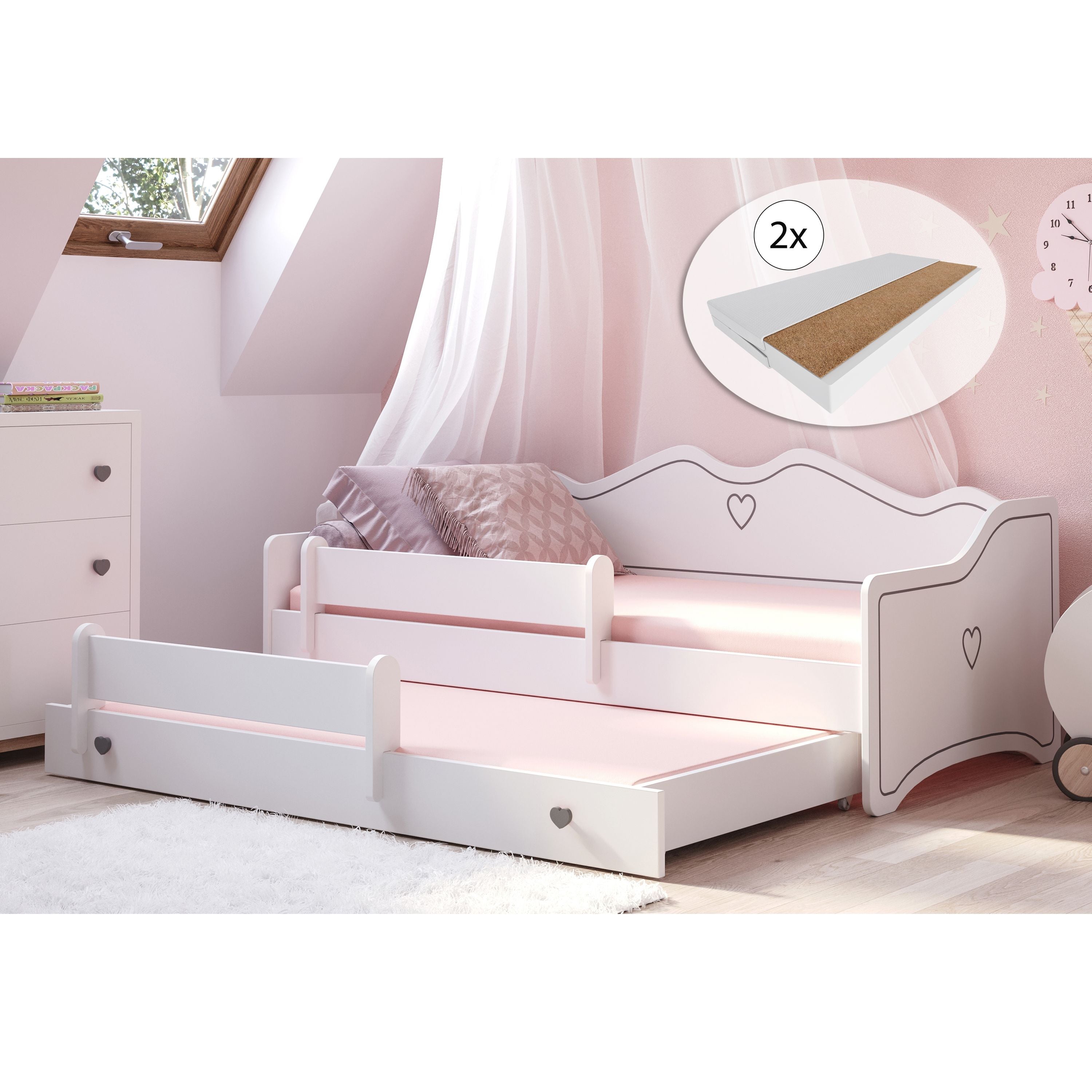 Ausziehbett & 2 Matratzen | Prinzessin-Design | Rausfallschutz | Weiß-Pink | 80 × 160 cm