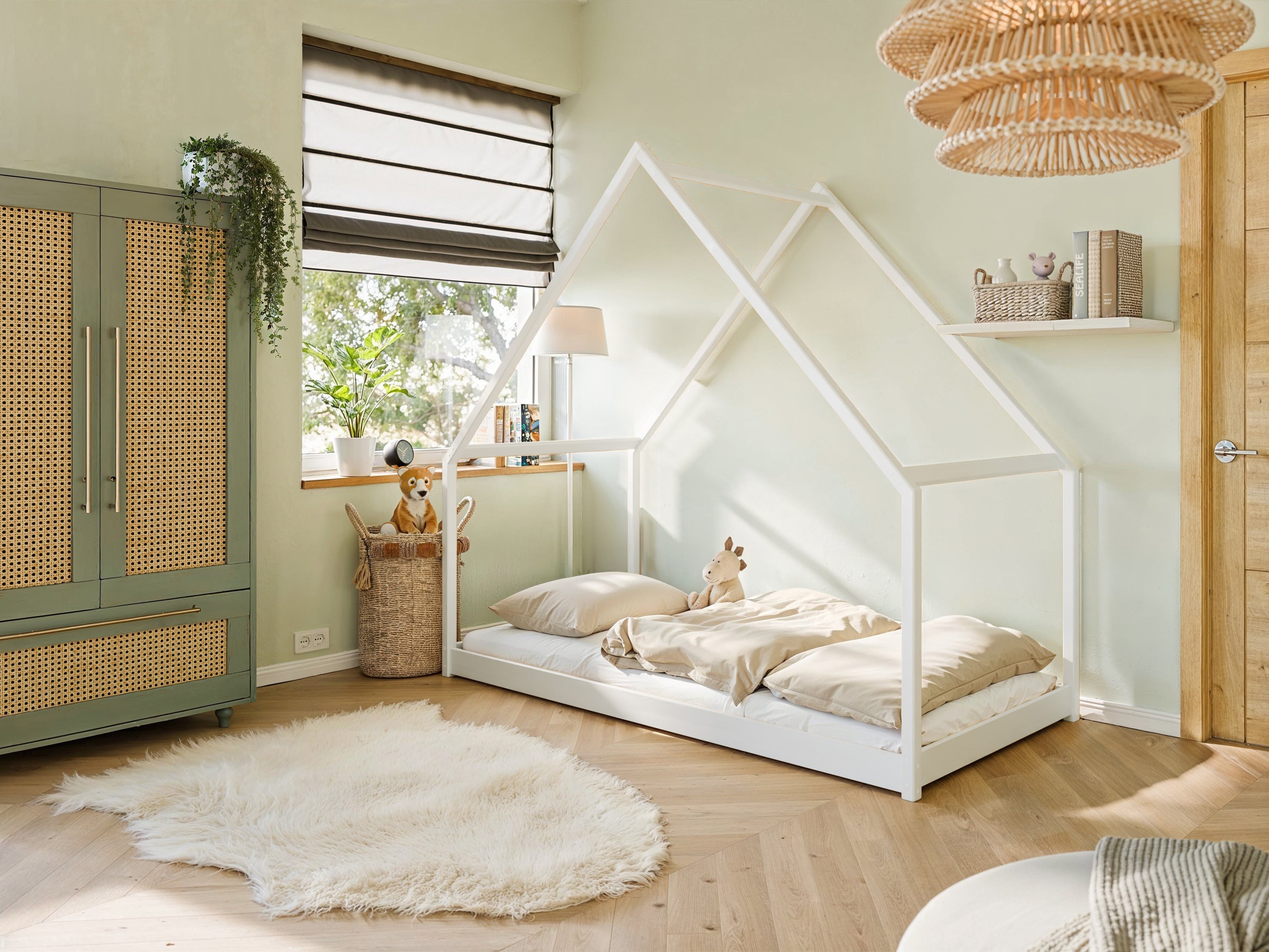 Das moderne Hausbett für Kinder in Weiß und Natur ist der ideale Schlafplatz für vorschulische und ältere Kinder. Es schafft eine beruhigende Atmosphäre im Kinderzimmer und bietet gleichzeitig Komfort und Sicherheit. Mit seinem modernen, modischen und dennoch minimalistischen Design passt dieses Bett perfekt in jeden Raum. Es wird nicht nur zum Schlafplatz, sondern auch zum Spielbereich, der die kindliche Vorstellungskraft erblühen lässt. Schaffen Sie für Ihr Kind einen unvergesslichen Raum voller Charme und Fantasie, in dem magische Abenteuer jeden Tag beginnen.