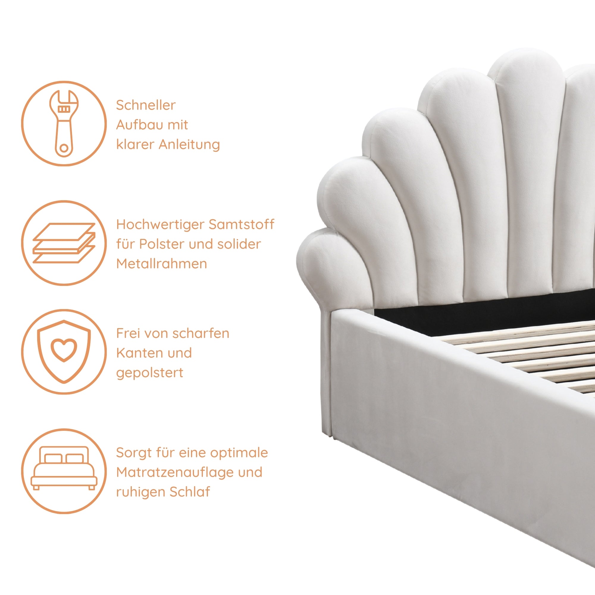 Dieses bezaubernde Kinderbett mit gepolstertem, muschelförmigem Kopfteil verbindet märchenhaftes Design mit kindgerechtem Komfort und Sicherheit. Der edle Samtstoff verleiht dem Bett eine elegante Optik und sorgt für ein weiches, behagliches Schlaferlebnis – perfekt für kleine Prinzessinnen und liebevoll eingerichtete Kinderzimmer.