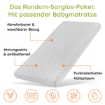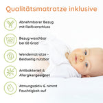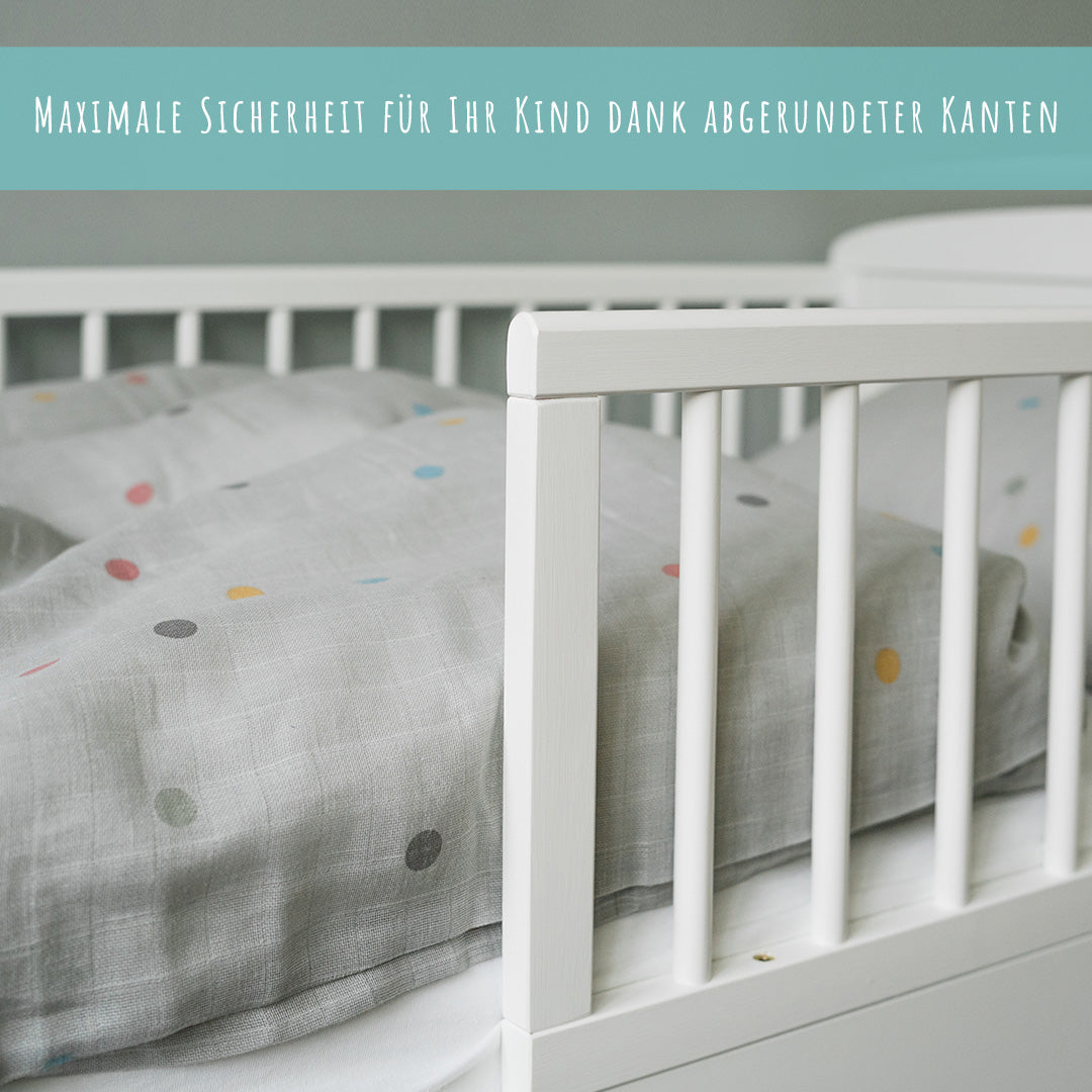 - Der Rausfallschutz kann je nach Stellposition des Bettes links oder rechts angebracht werden, oder gänzlich abgenommen werden.