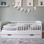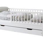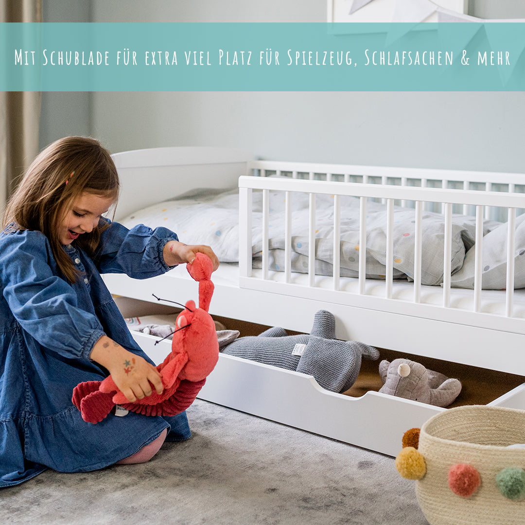 Dieses praktische Funktionsbett ist die perfekte Wahl für moderne Familien. Das schlichte weiß und die hochwertige Verarbeitung aus Kiefernholz zeugen von gutem Geschmack und die Features dieses Kinderbettes überzeugen die anspruchsvollsten Eltern: Das Bett wird mit Lattenrost und variabel einsetzbarem Rausfallschutz geliefert. Und das Allerbeste: Eine praktische Schublade ist auch mit dabei. So ist schnell alles verstaut und Ordnung geschaffen.