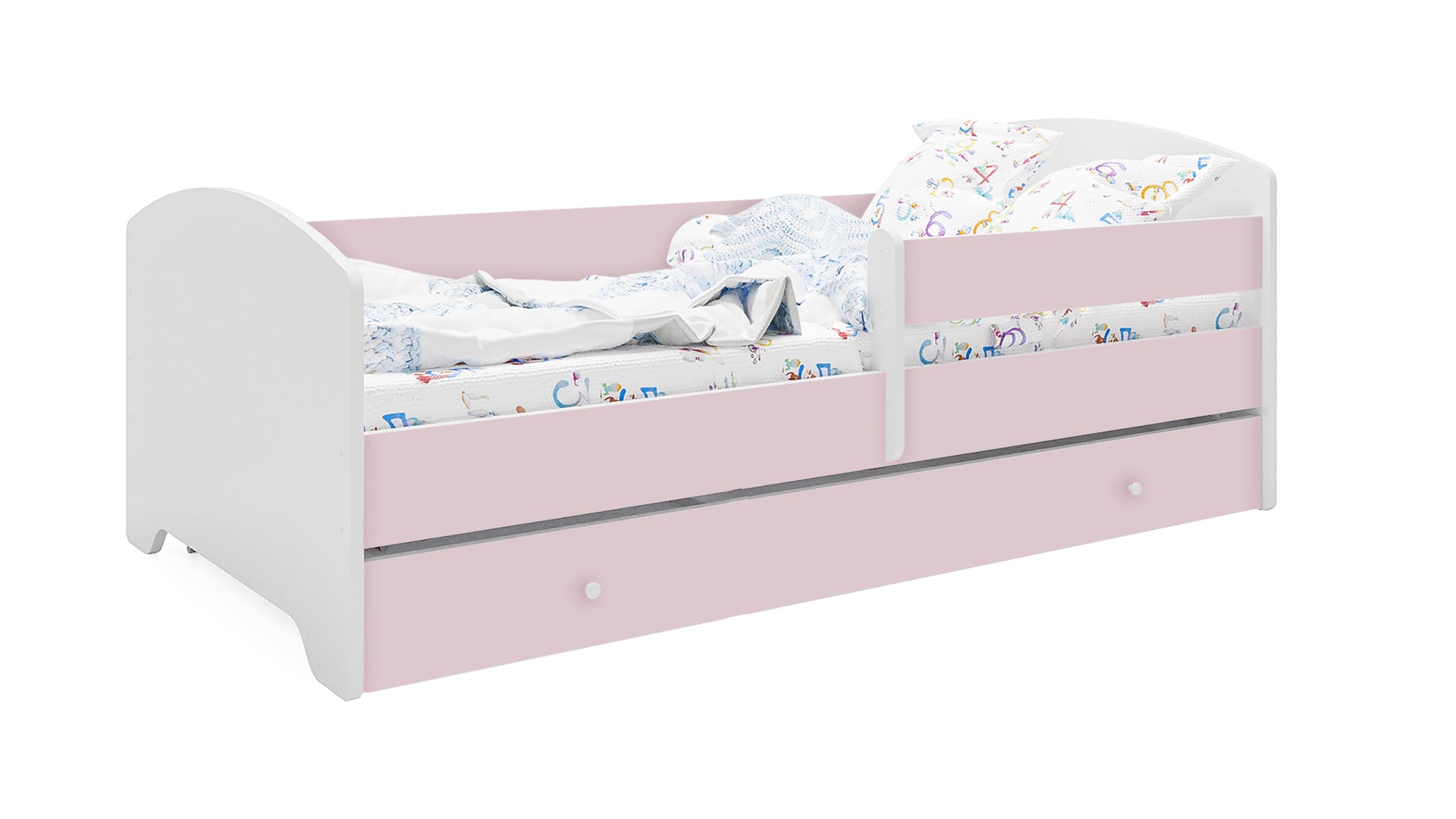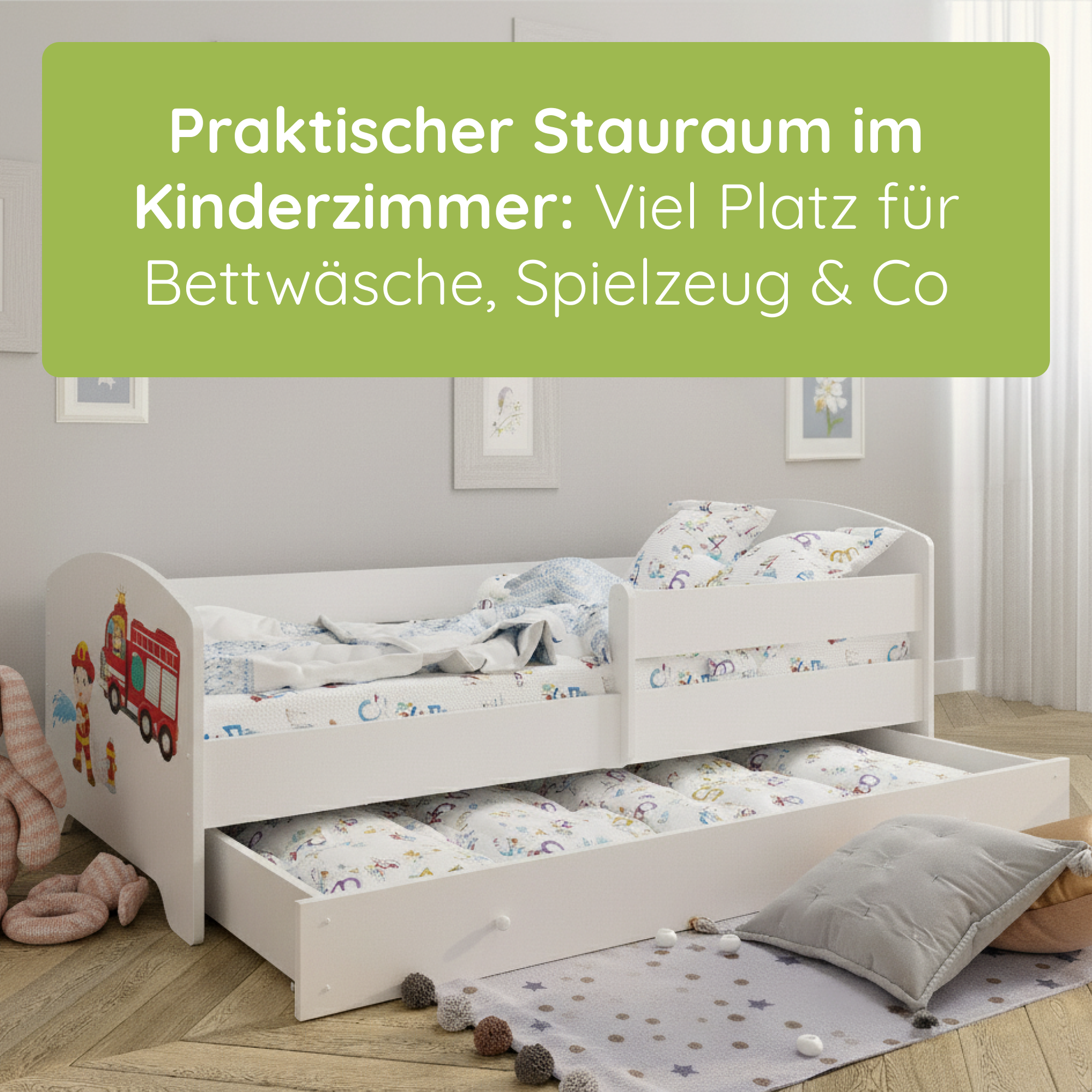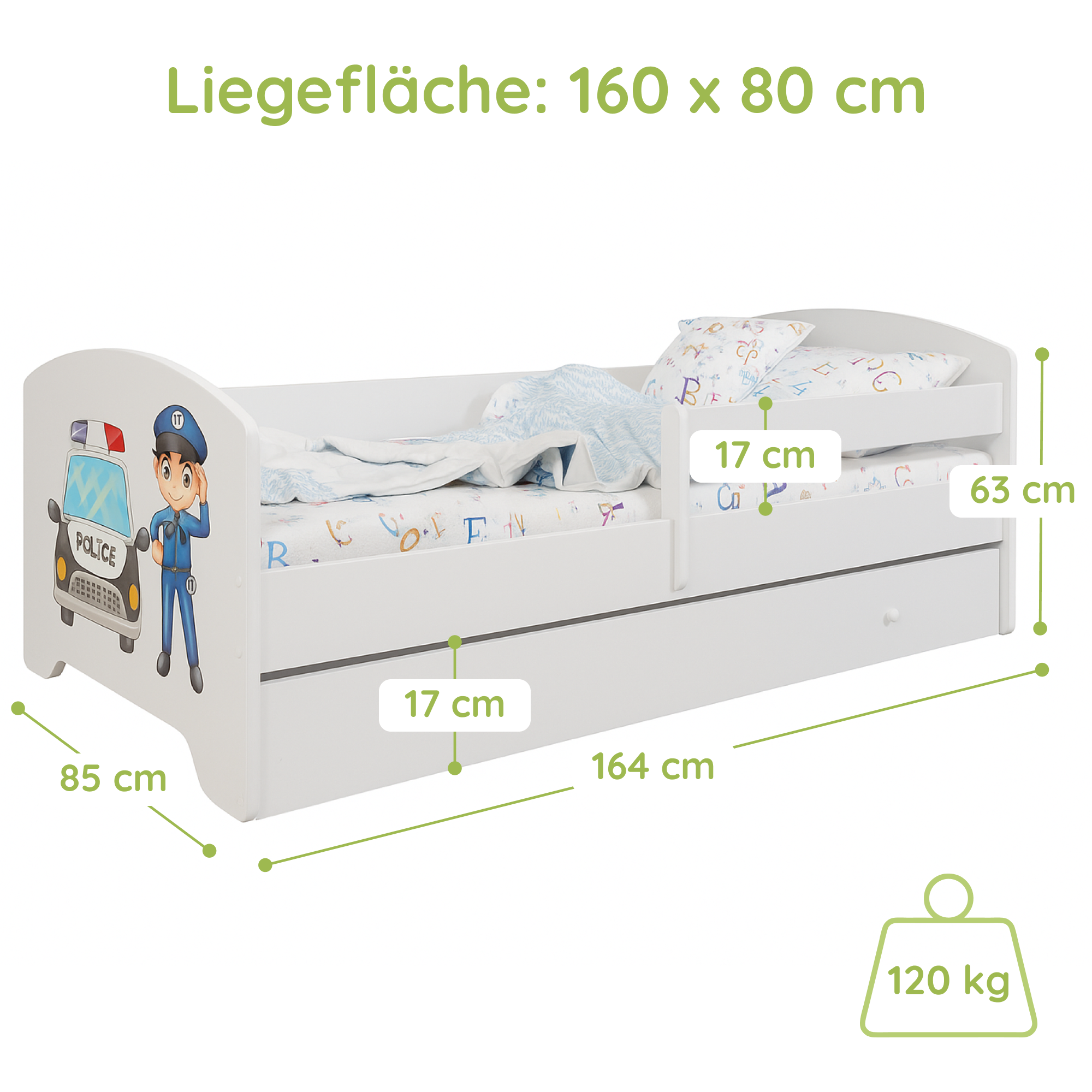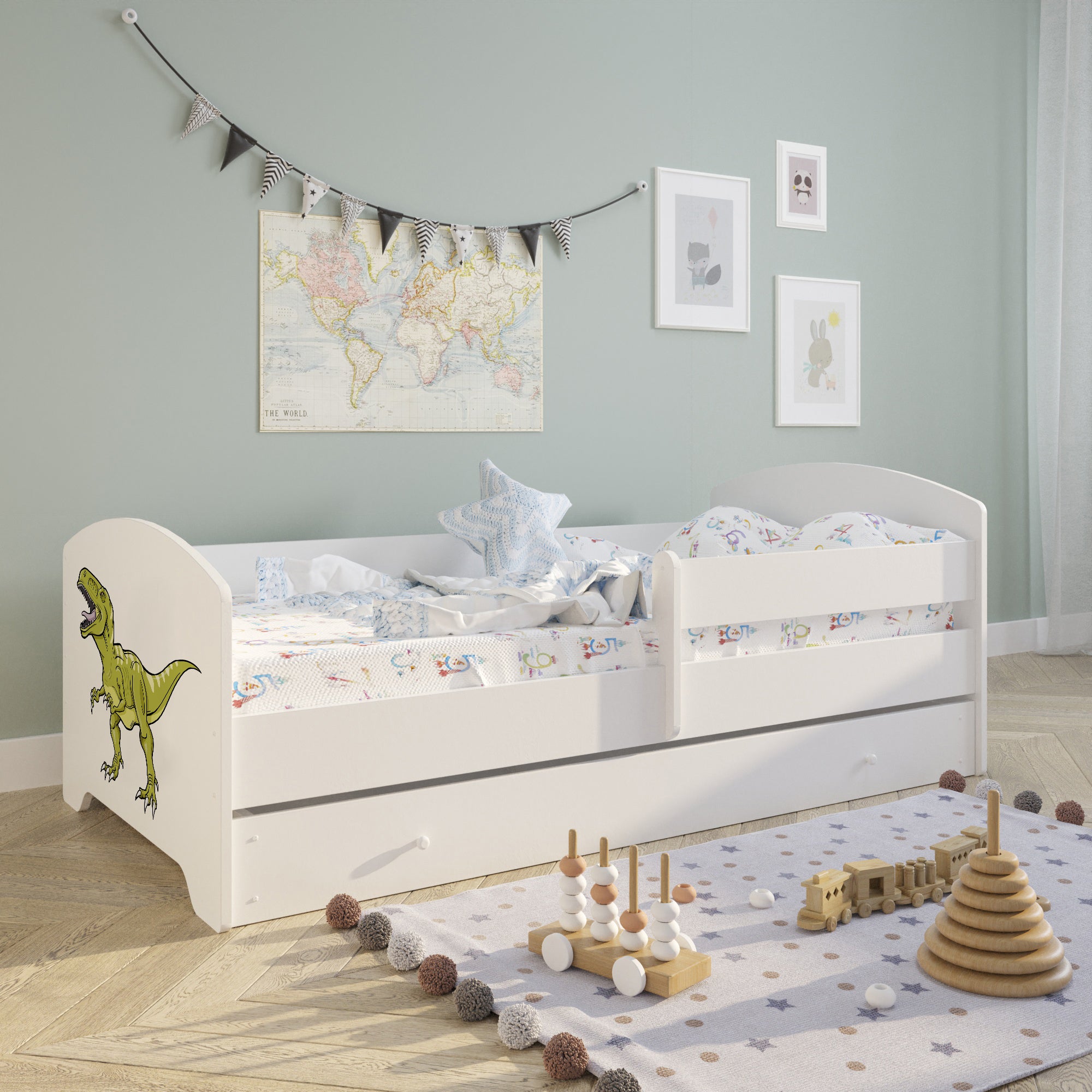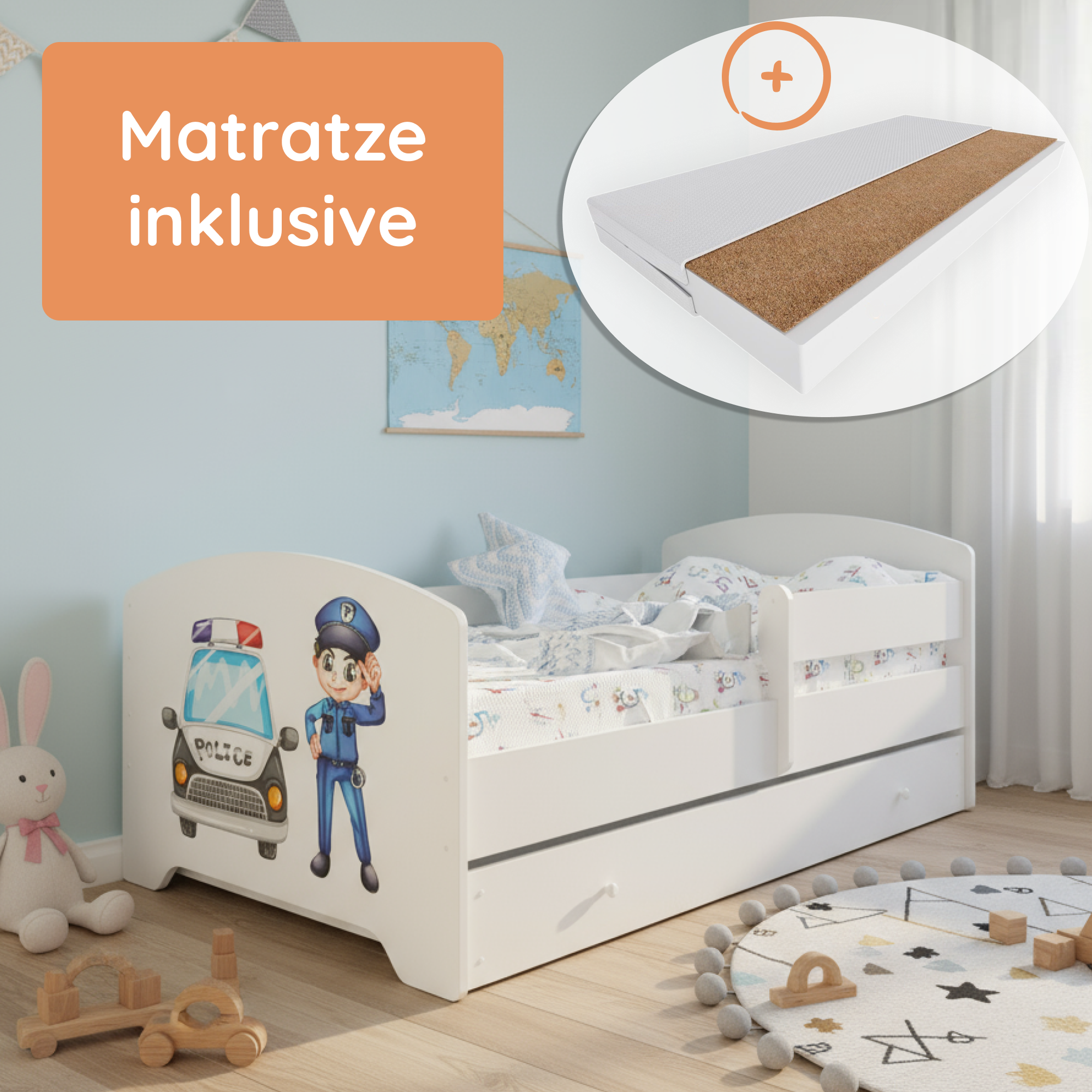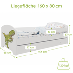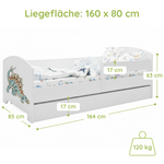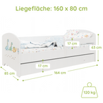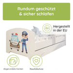 Dieser Kinderbett ist in mehreren kindgerechten Motiven erhältlich und fügt sich so individuell in jedes Kinderzimmer ein.