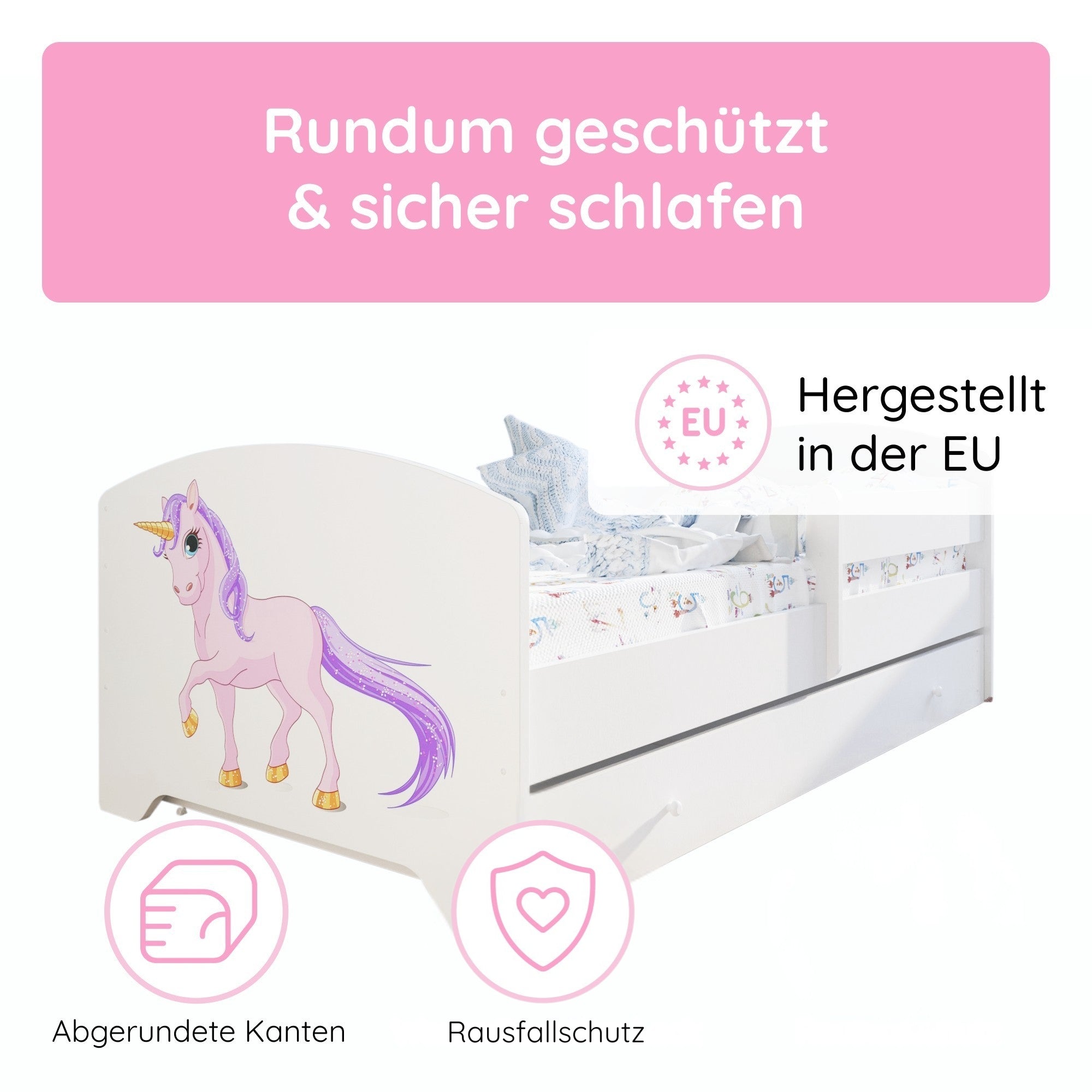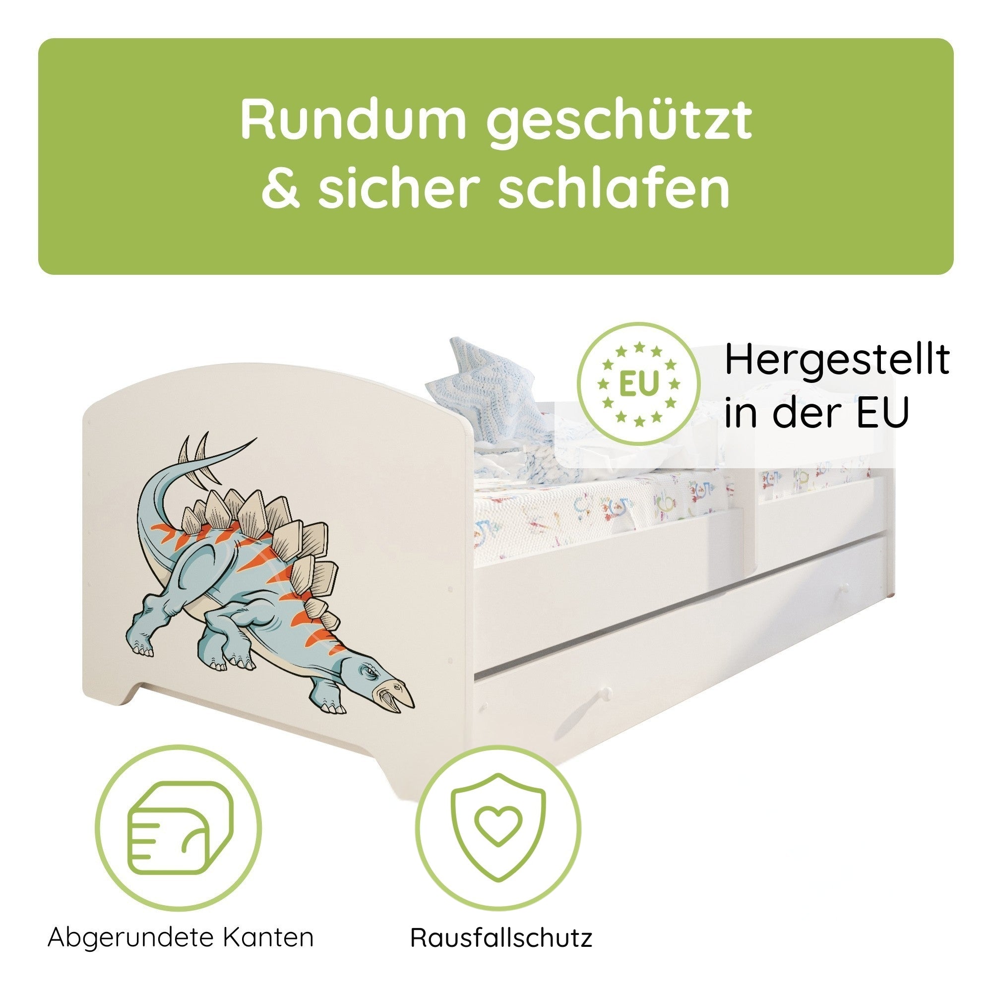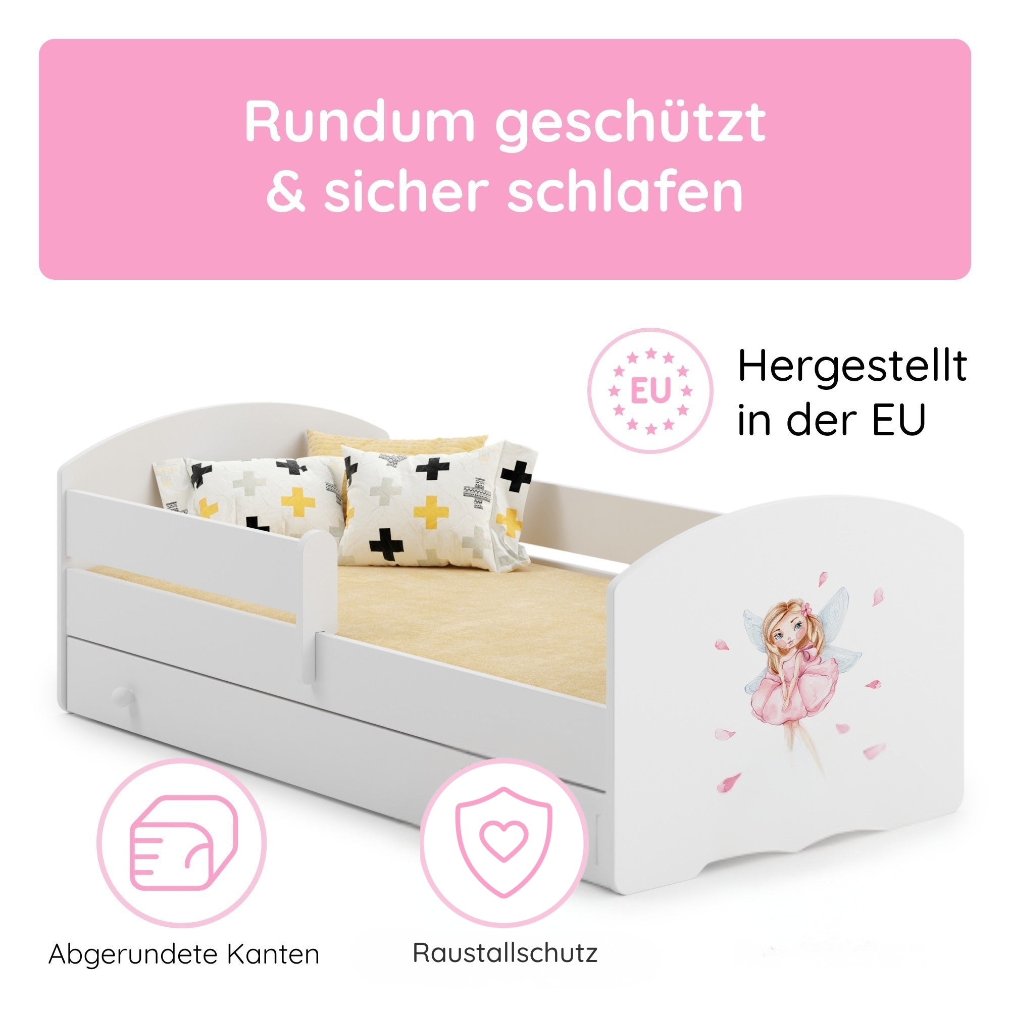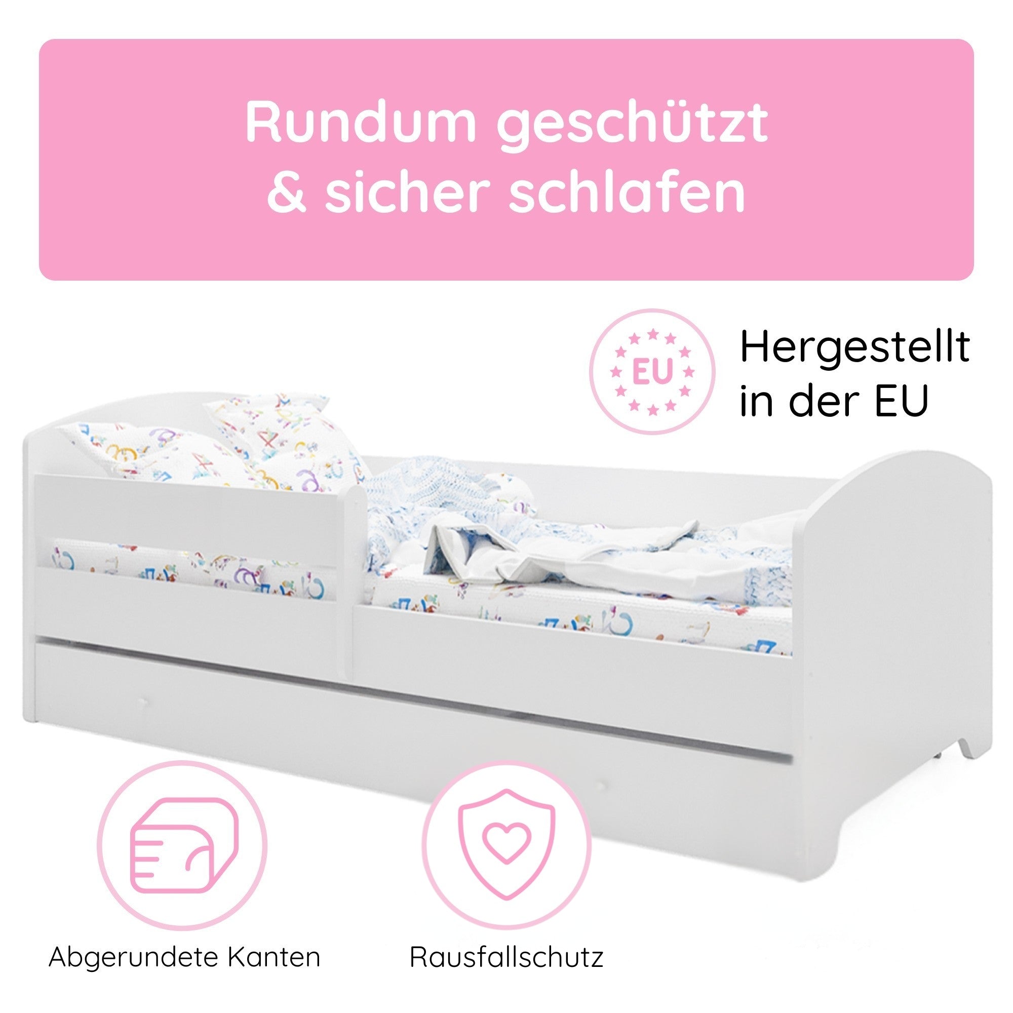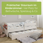 Dieses stabile Kinderbett Komplett-Set mit einer Liegefläche von 70x140 cm und 80x160 cm ist die perfekte Schlaflösung für Kinder ab ca. 2 Jahren. Gefertigt in europäischen Familienbetrieben aus robustem Holzwerkstoff und lackiert mit speichel- und schadstofffreien Farben auf Wasserbasis, erfüllt es wichtige Anforderungen an Sicherheit und Nachhaltigkeit.