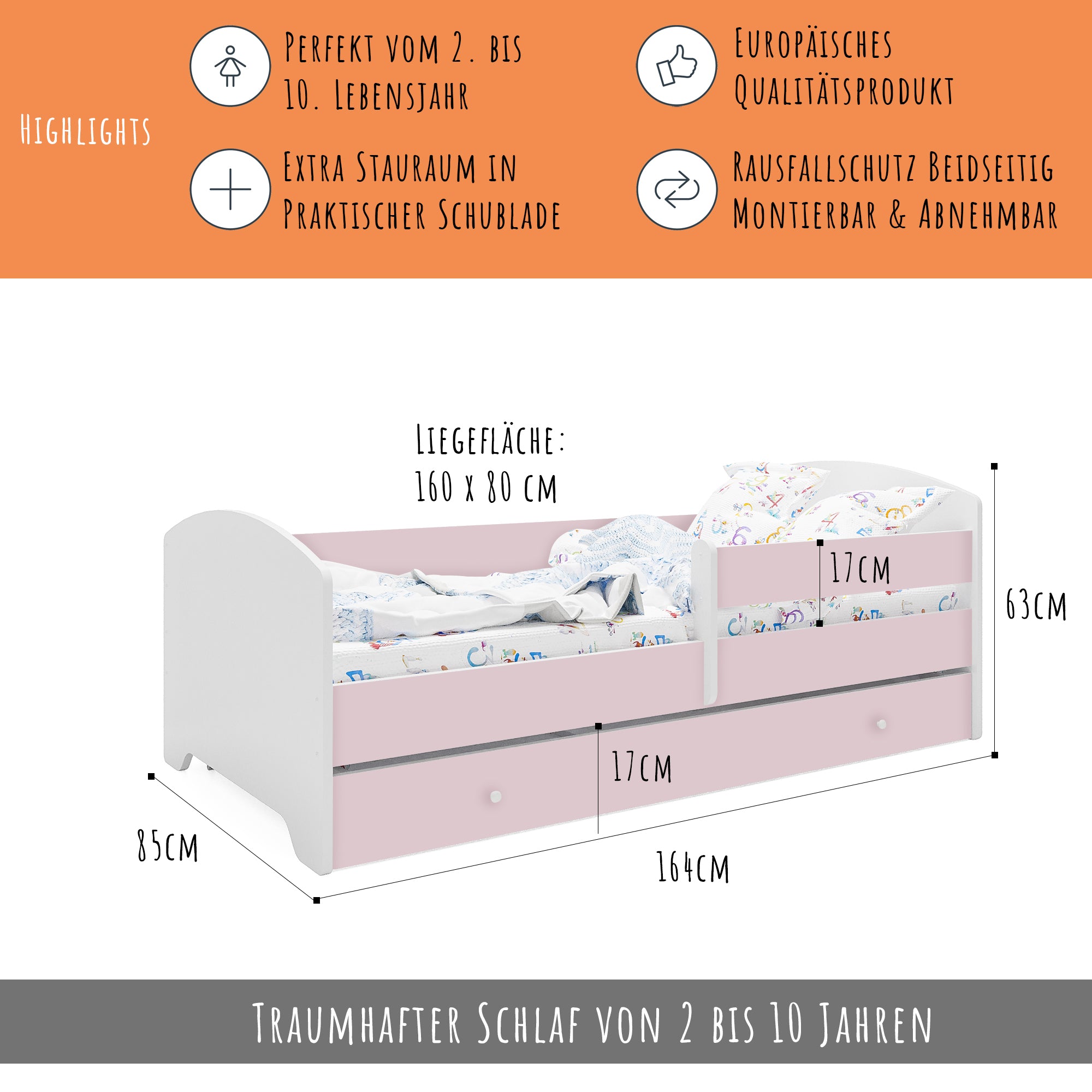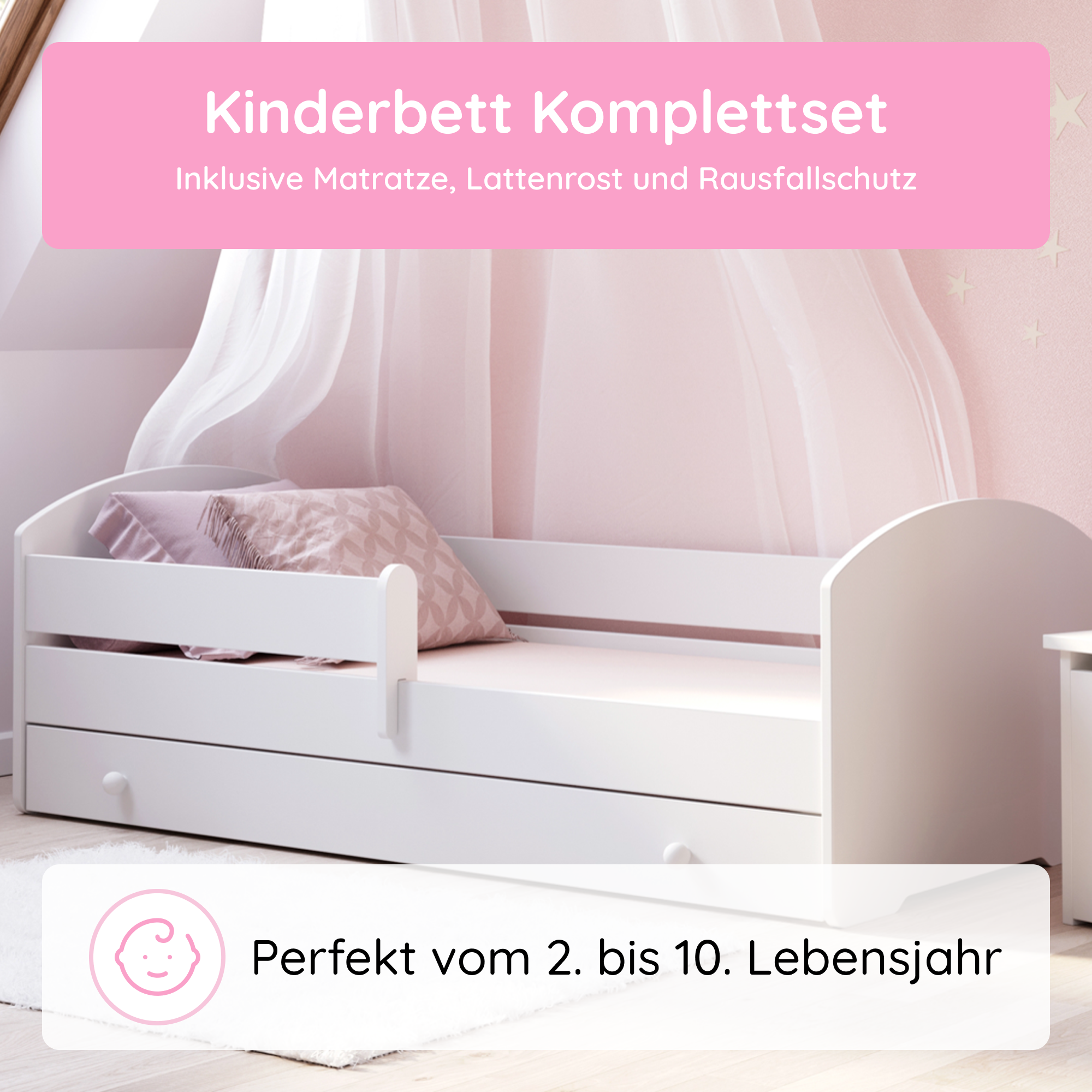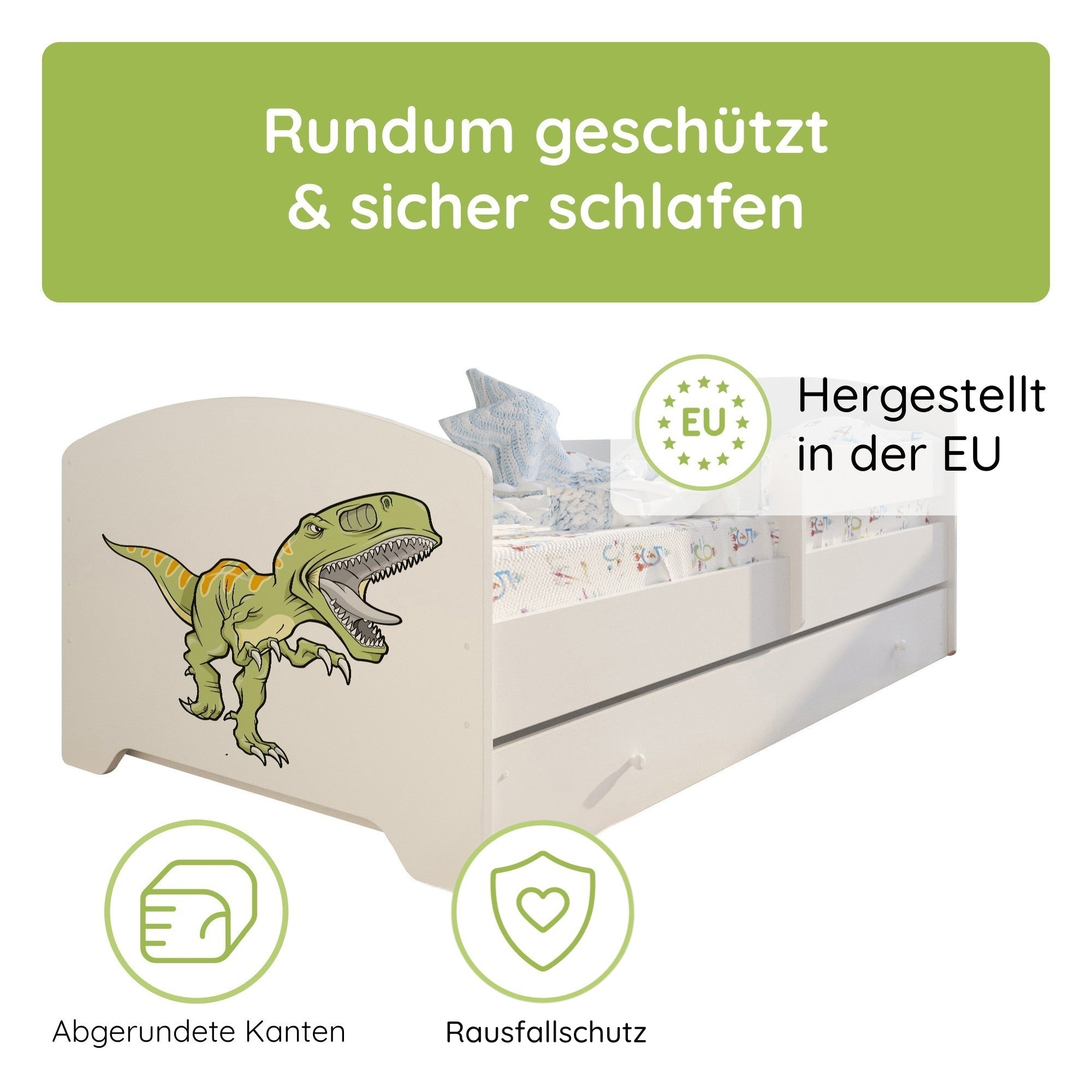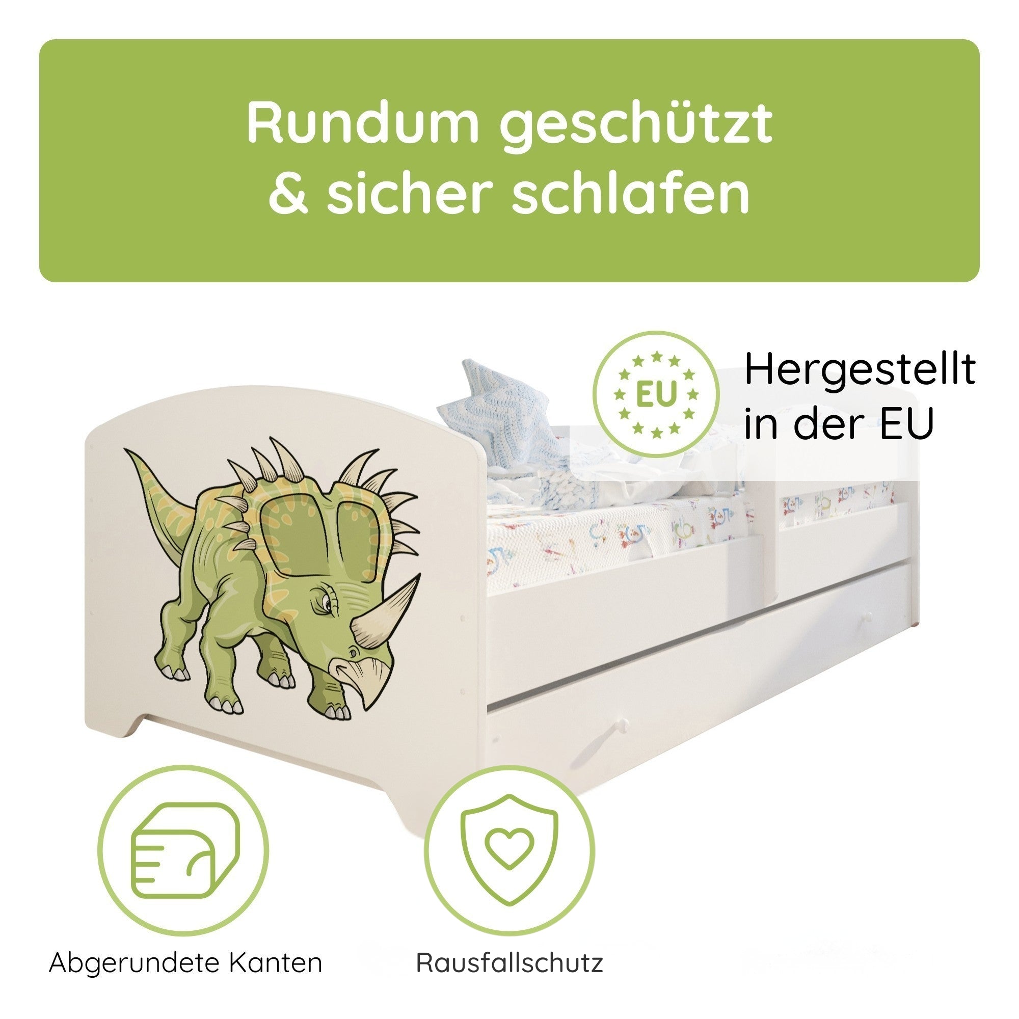 Dieses stabile Kinderbett Komplett-Set mit einer Liegefläche von 70x140 cm und 80x160 cm ist die perfekte Schlaflösung für Kinder ab ca. 2 Jahren. Gefertigt in europäischen Familienbetrieben aus robustem Holzwerkstoff und lackiert mit speichel- und schadstofffreien Farben auf Wasserbasis, erfüllt es wichtige Anforderungen an Sicherheit und Nachhaltigkeit.