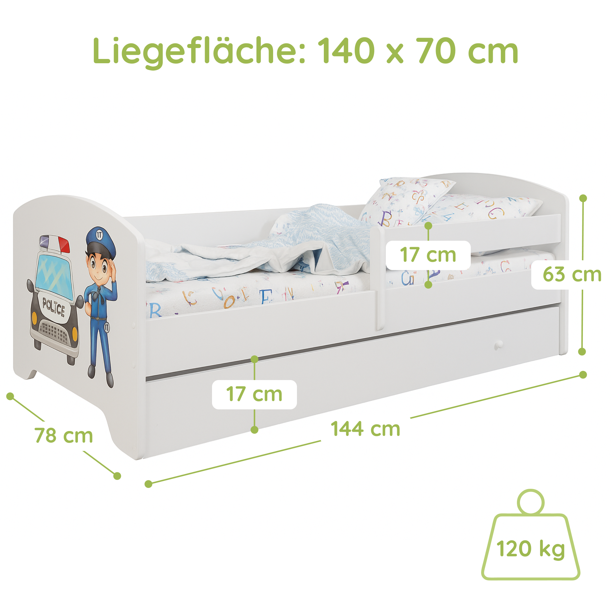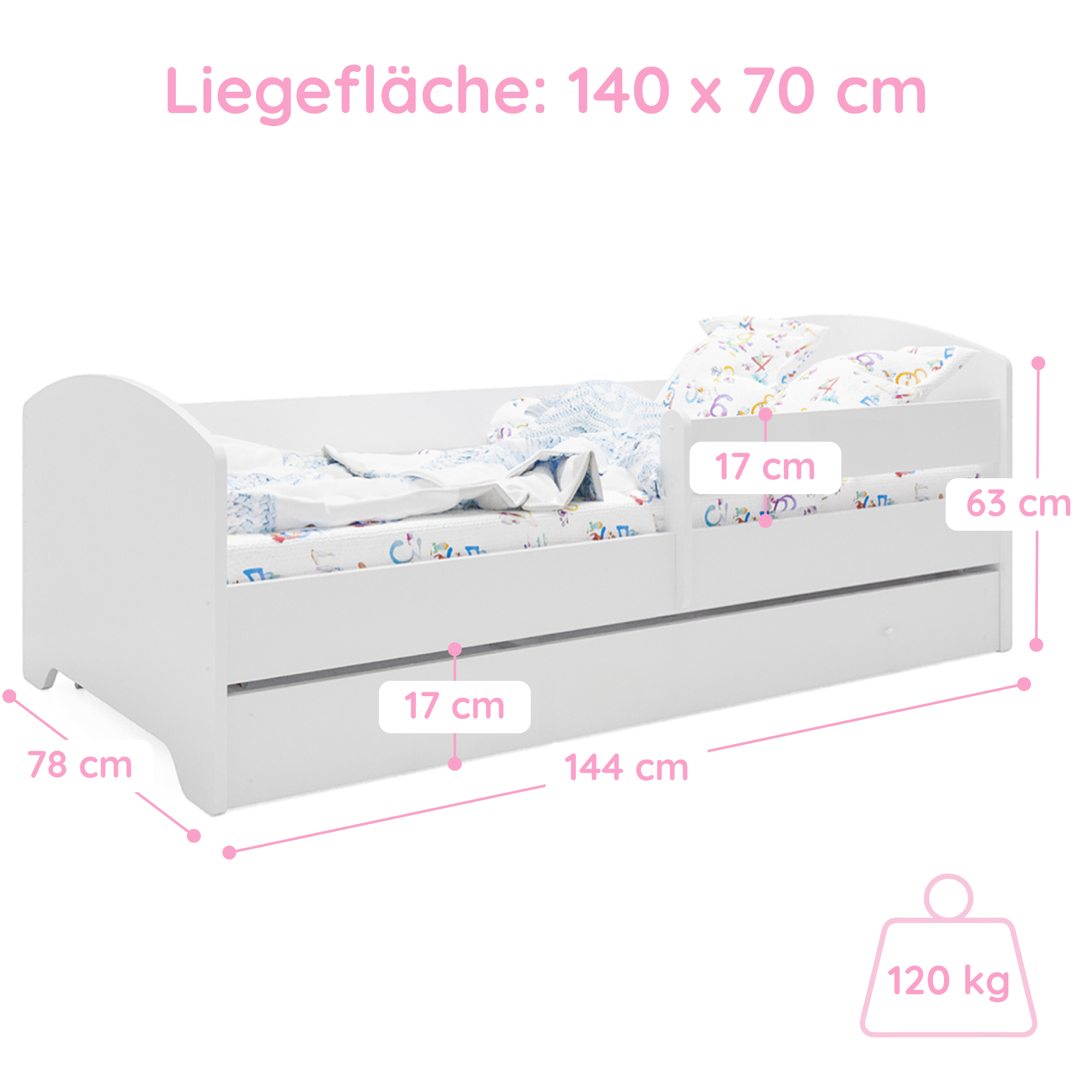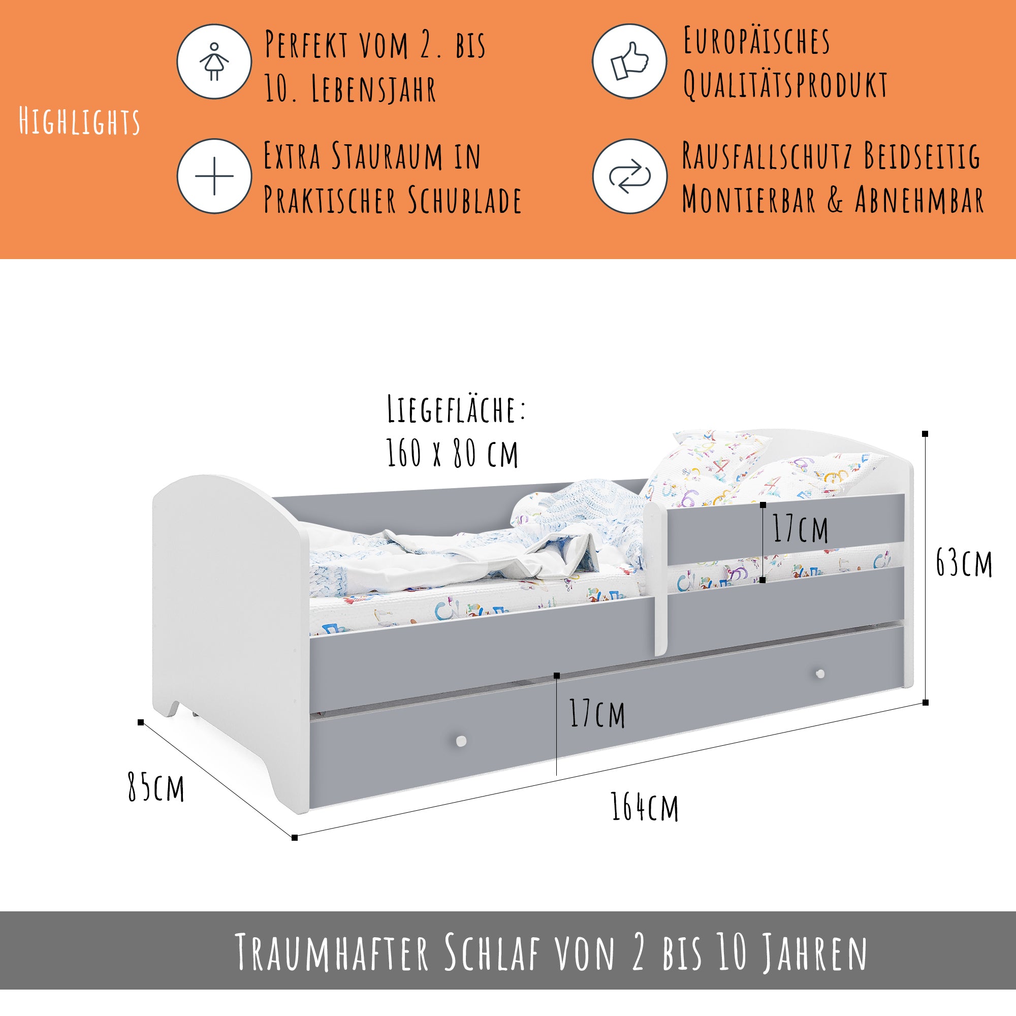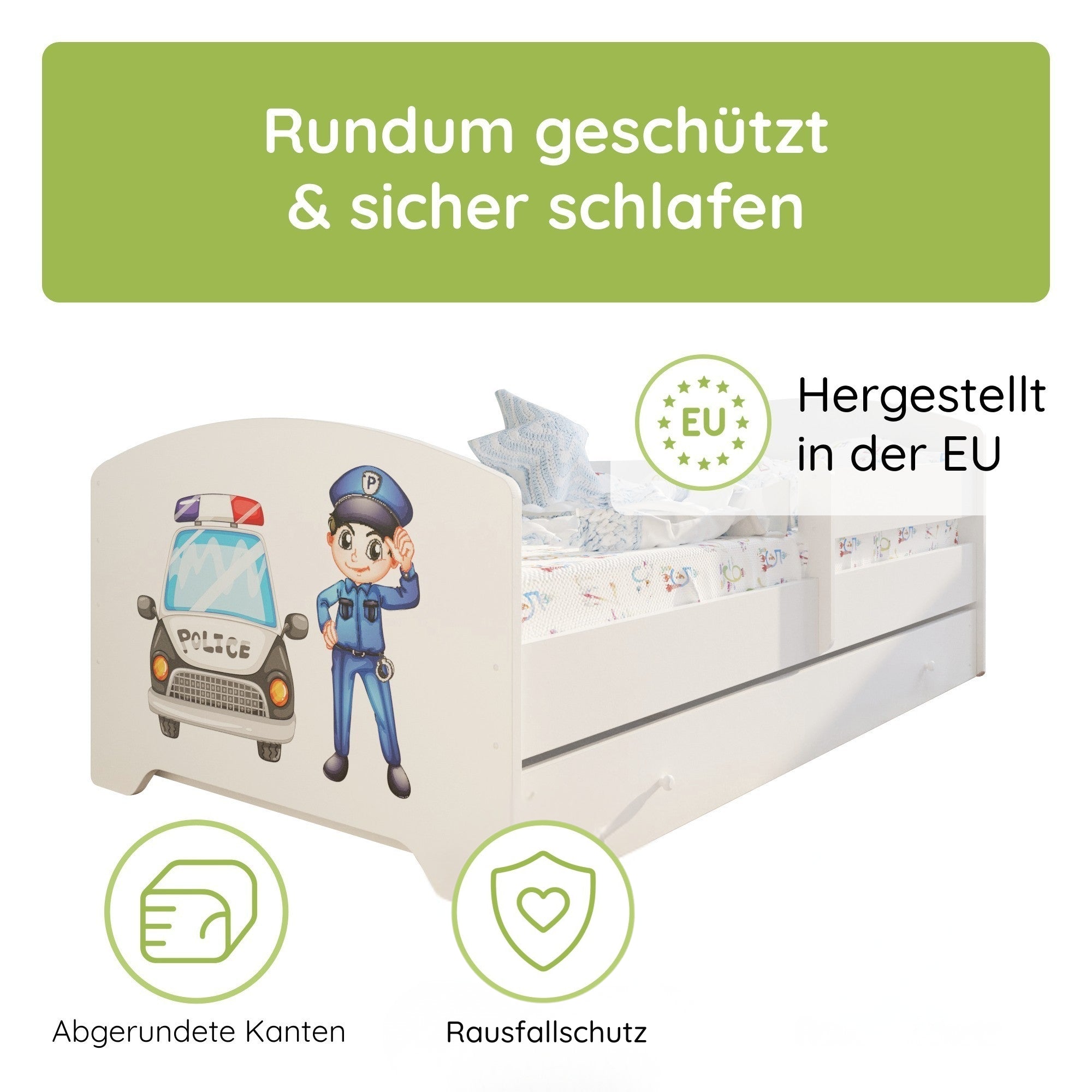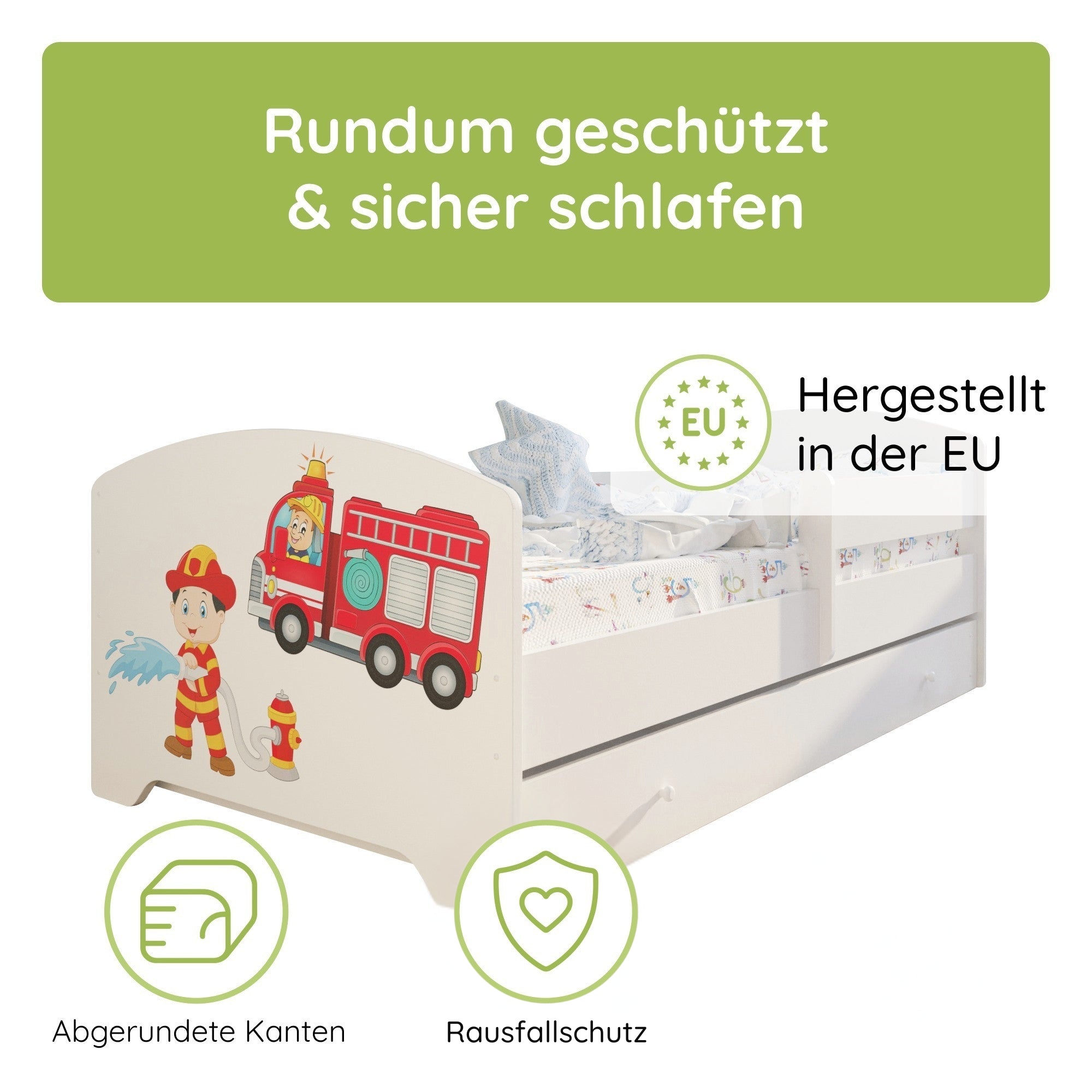 Dieses stabile Kinderbett Komplett-Set mit einer Liegefläche von 70x140 cm und 80x160 cm ist die perfekte Schlaflösung für Kinder ab ca. 2 Jahren. Gefertigt in europäischen Familienbetrieben aus robustem Holzwerkstoff und lackiert mit speichel- und schadstofffreien Farben auf Wasserbasis, erfüllt es wichtige Anforderungen an Sicherheit und Nachhaltigkeit.