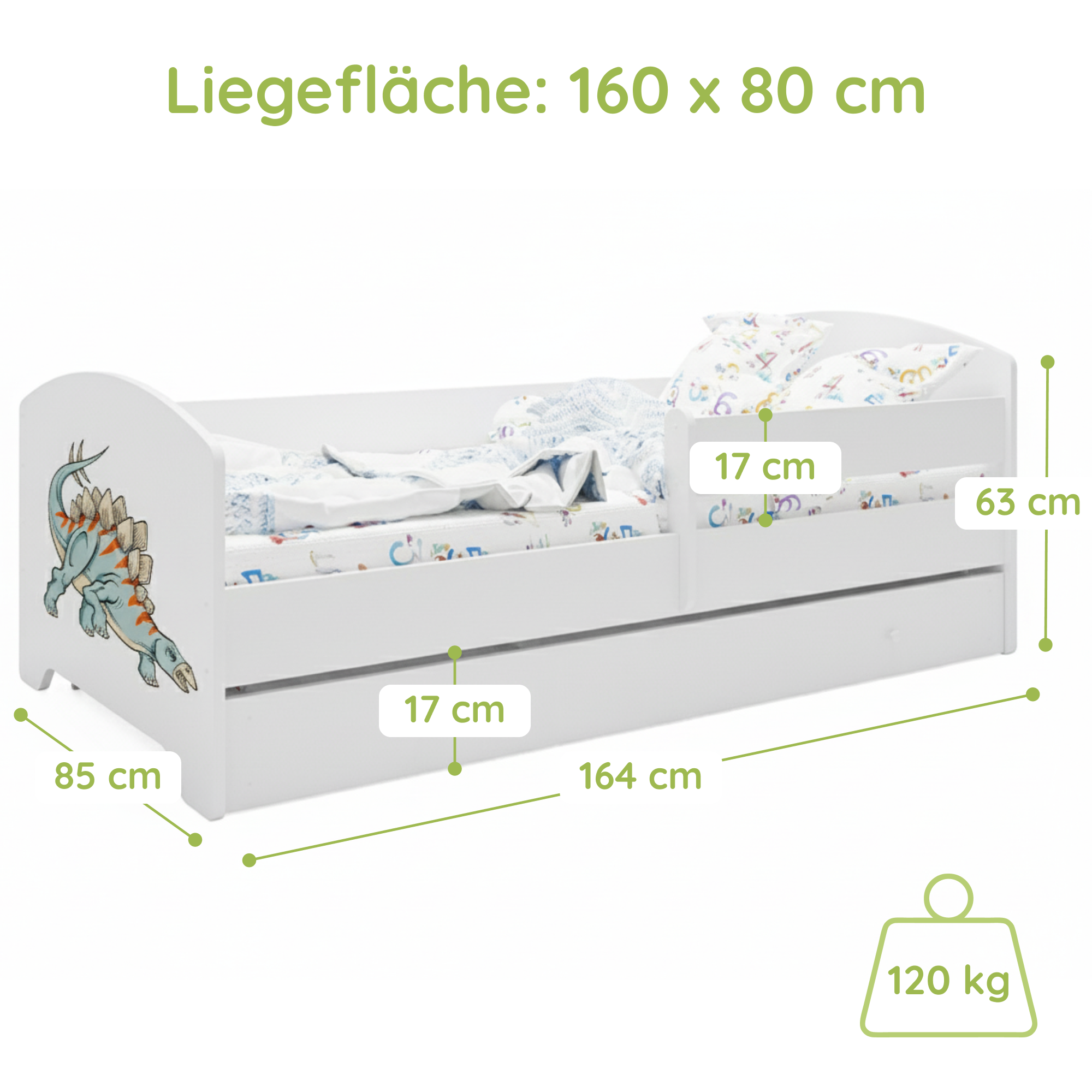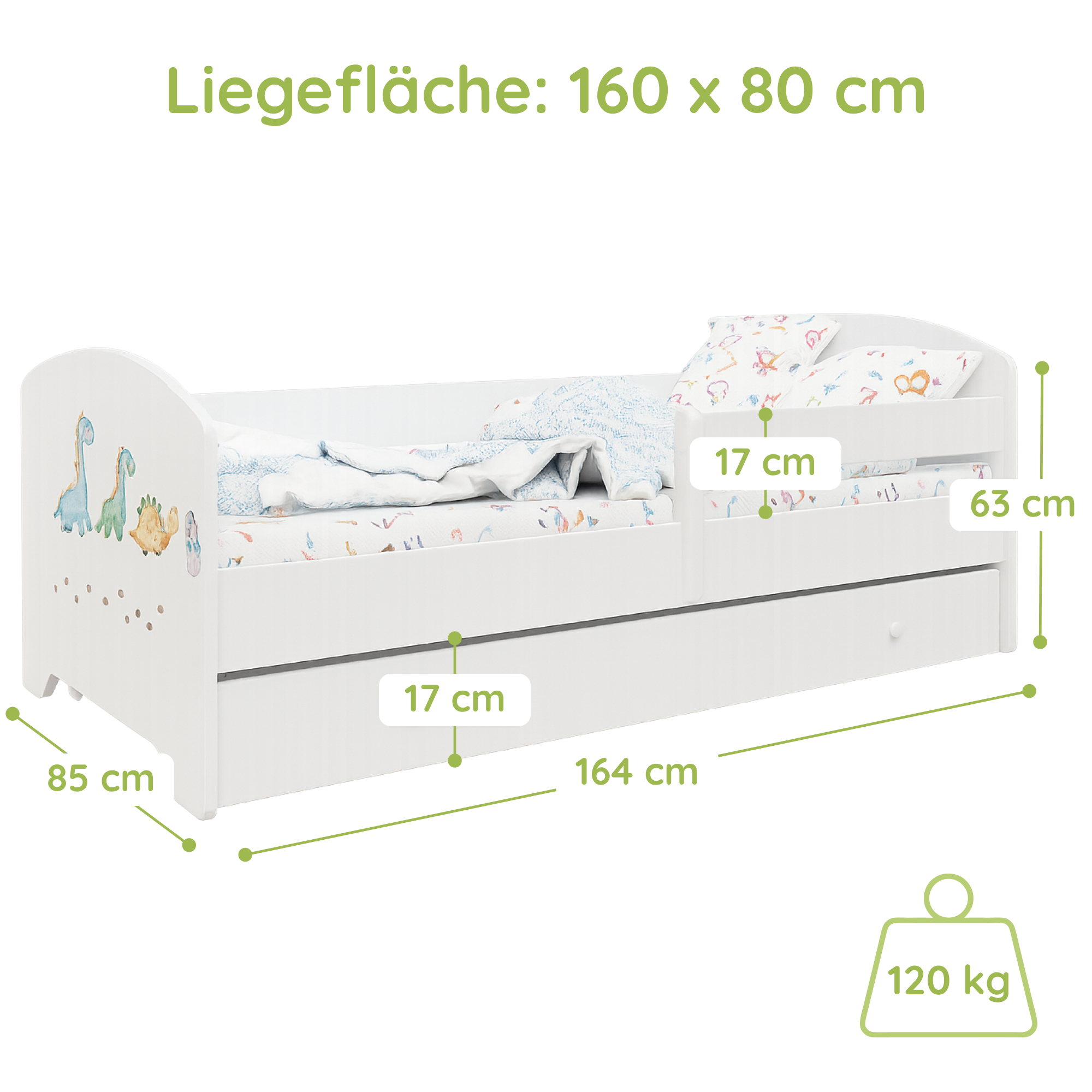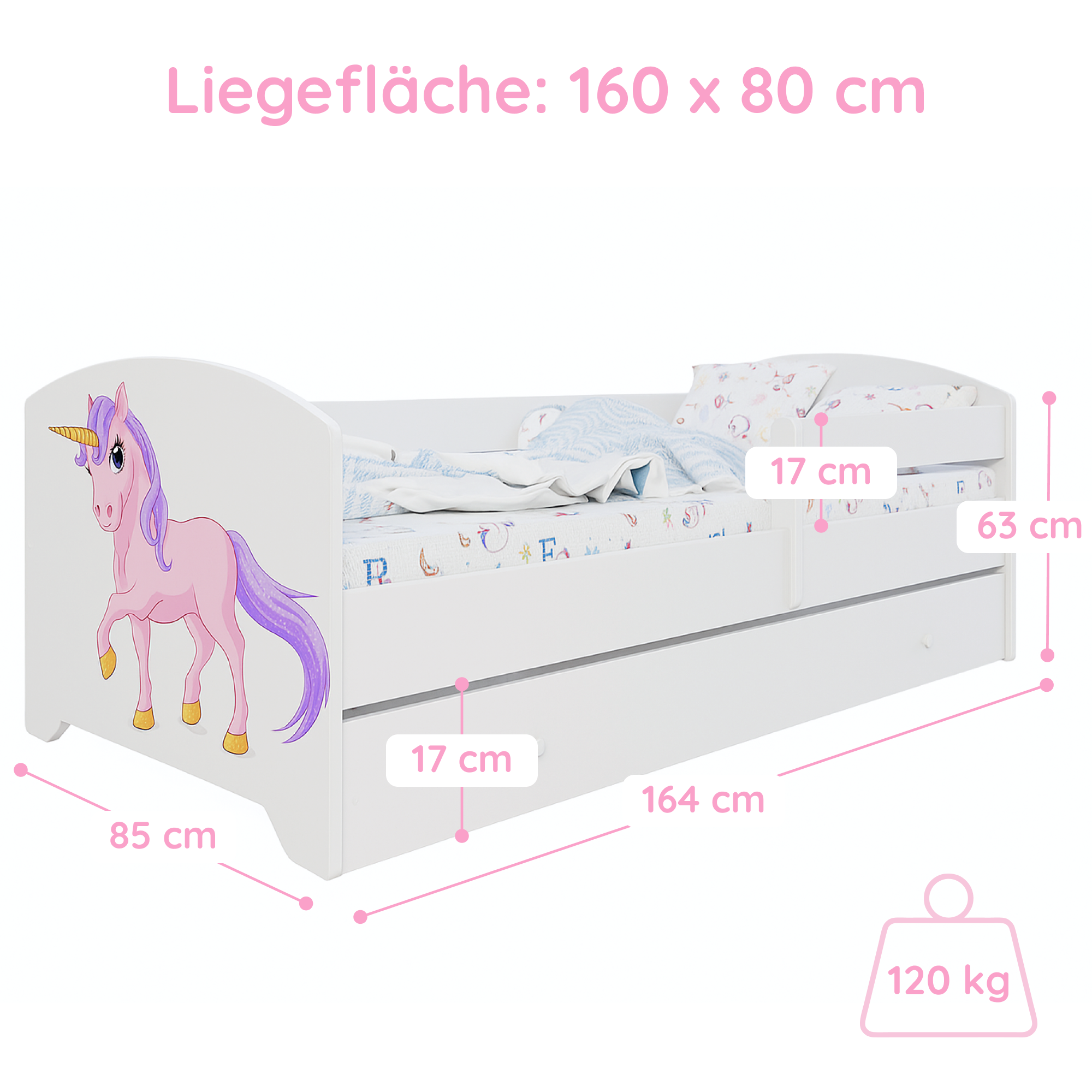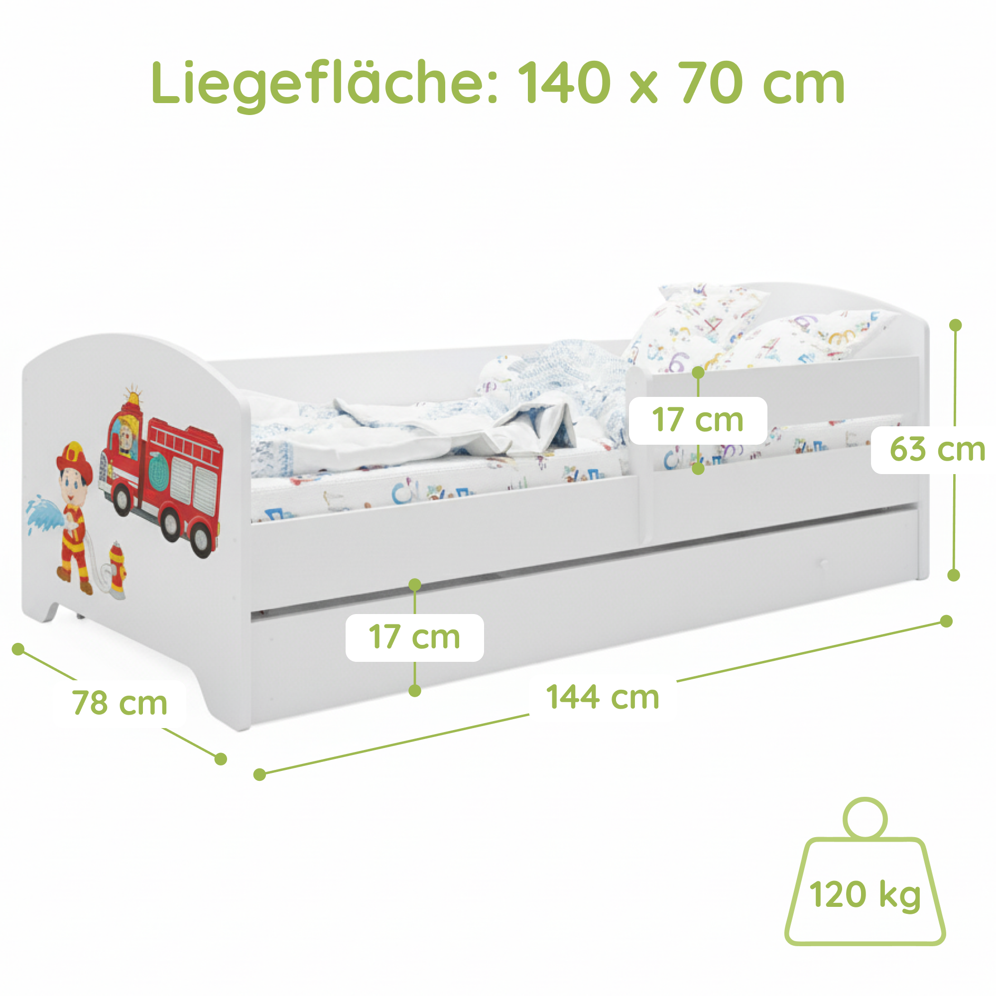 Dieses stabile Kinderbett Komplett-Set mit einer Liegefläche von 70x140 cm und 80x160 cm ist die perfekte Schlaflösung für Kinder ab ca. 2 Jahren. Gefertigt in europäischen Familienbetrieben aus robustem Holzwerkstoff und lackiert mit speichel- und schadstofffreien Farben auf Wasserbasis, erfüllt es wichtige Anforderungen an Sicherheit und Nachhaltigkeit.