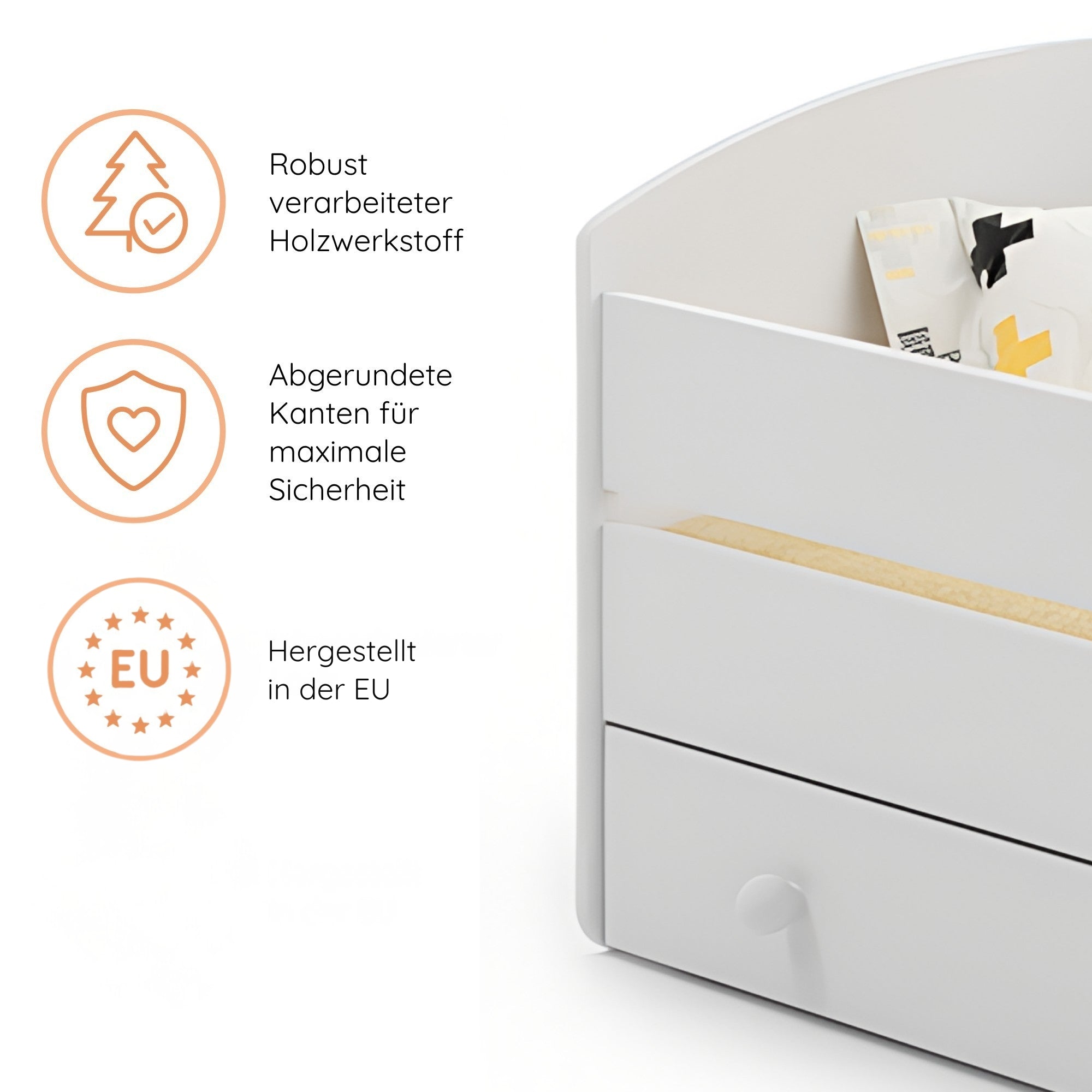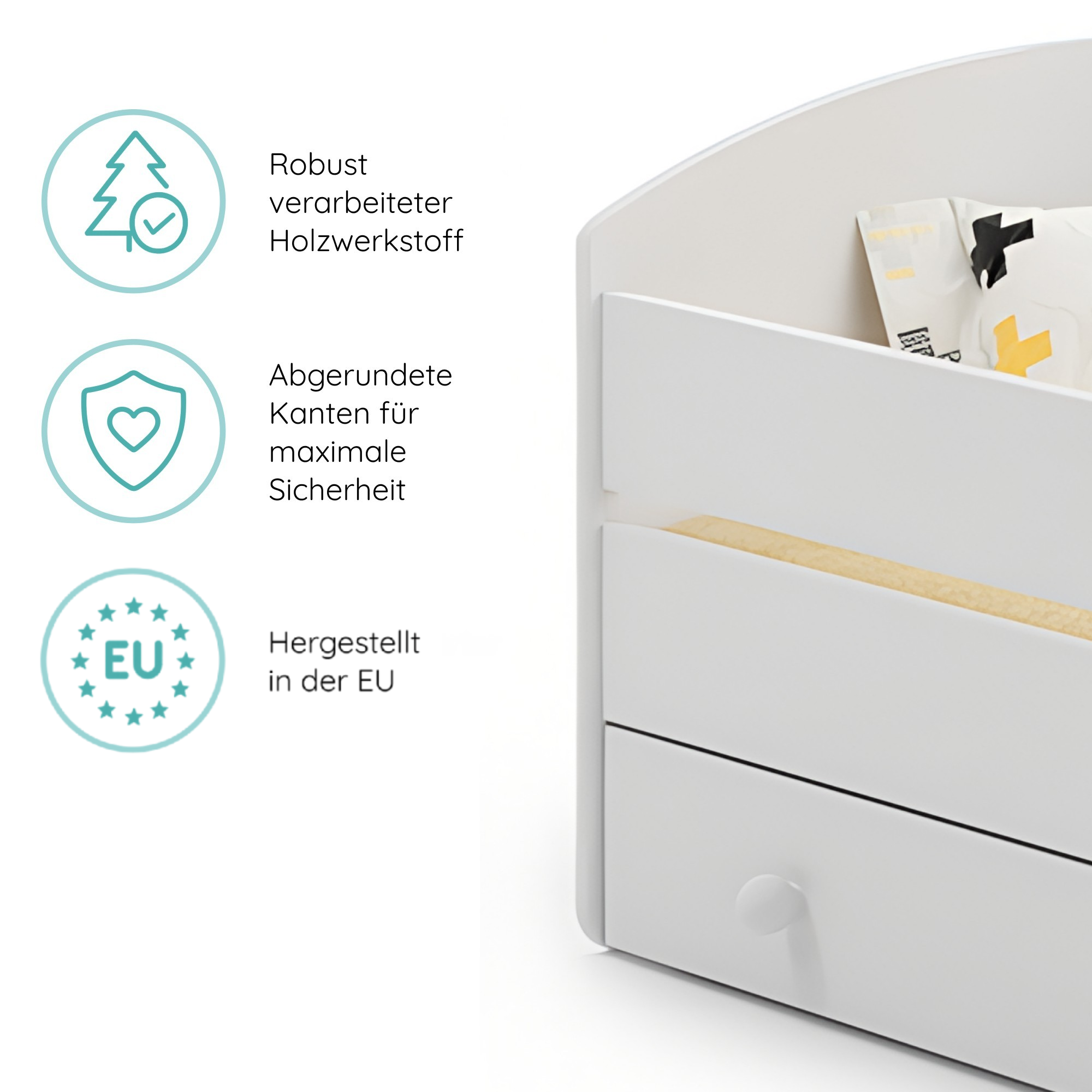 Wir setzen auf robusten Holzwerkstoff und eine wasserbasierte Lackierung für Stabilität, Nachhaltigkeit und eine sichere Schlafumgebung.