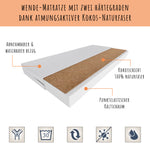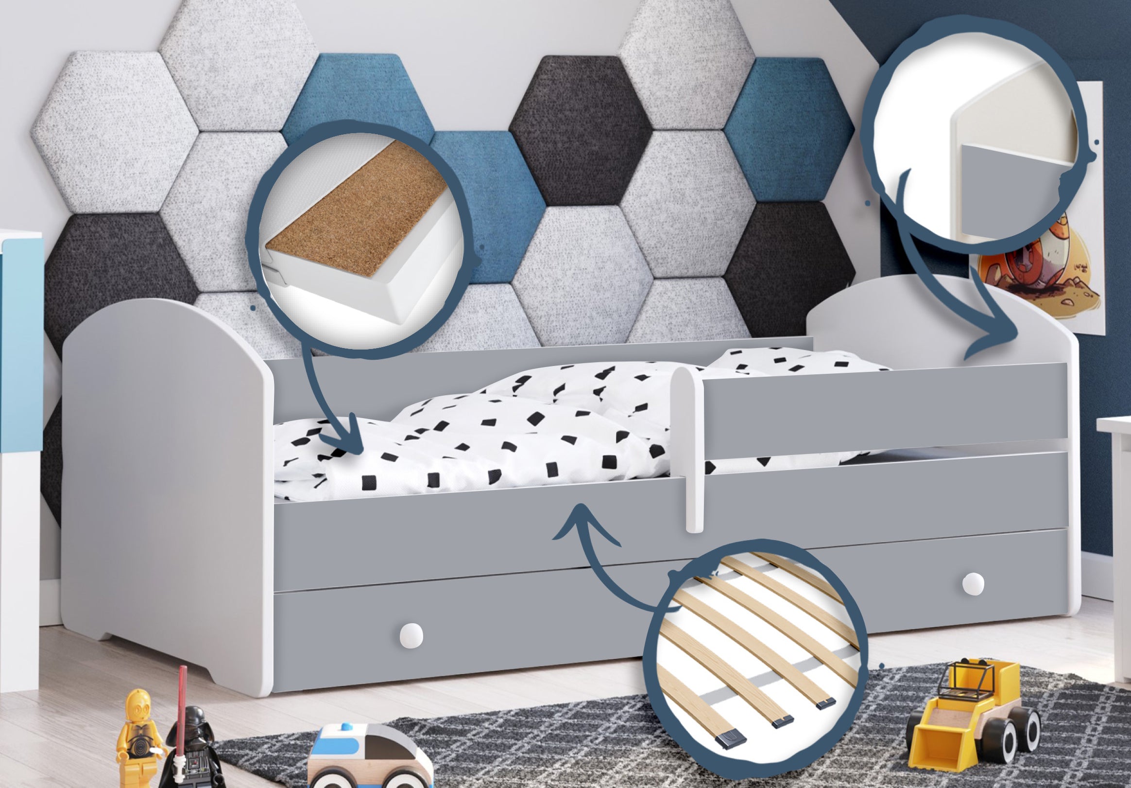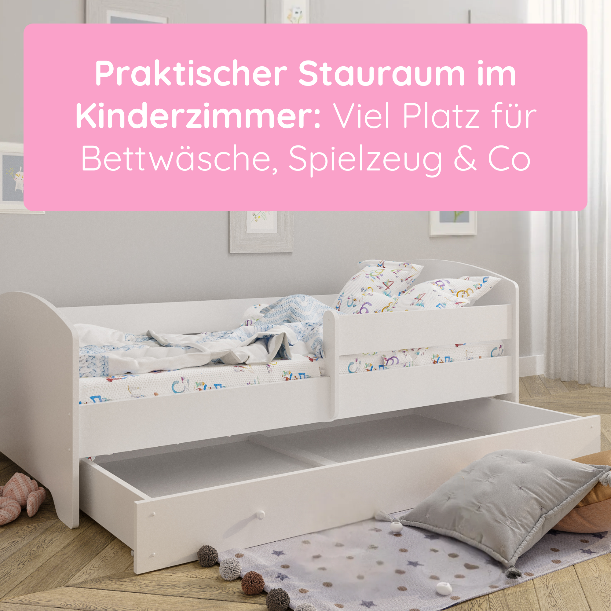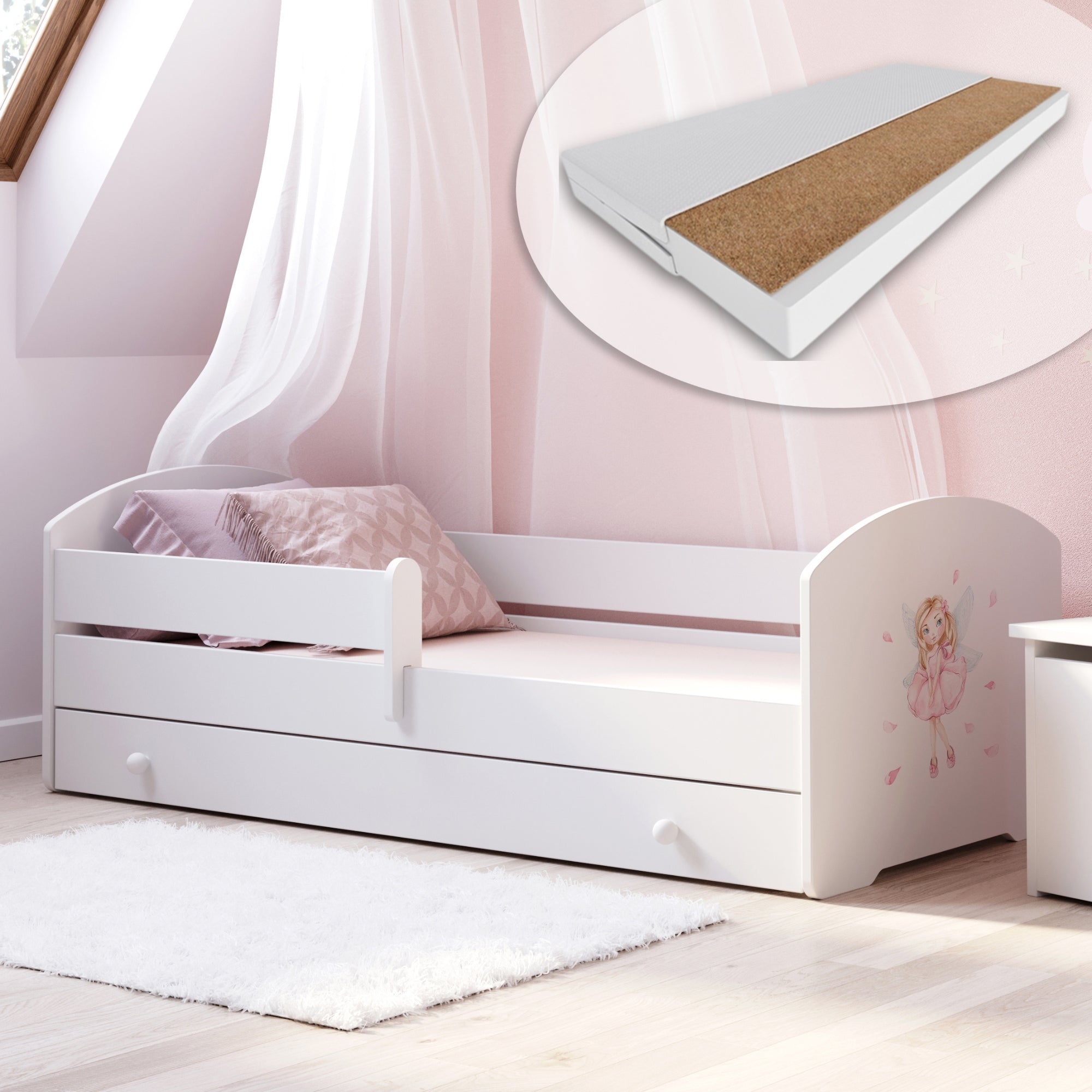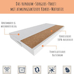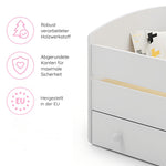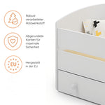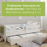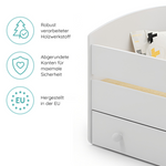 Im Lieferumfang enthalten sind eine passende punktelastische Kaltschaummatratze mit einer atmungsaktiven Kokosschicht aus 100% Naturfaser, ein Roll-Lattenrost und eine praktische Unterbett-Schublade. Die Schublade lässt sich dank gummierter Rollen leicht herausziehen und bietet viel Stauraum für Bettwäsche, Kleidung oder Spielzeug.