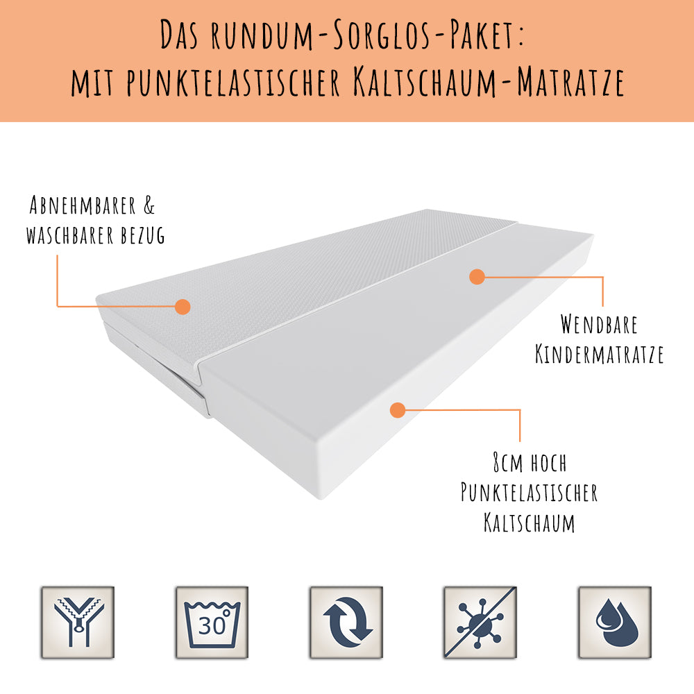 • Optional mit passender Matratze: Punktelastische Kaltschaummatratze mit perfekt abgestimmtem Härtegrad für Kinder. Die Matratze passt sich dem Körper in jeder Lage gut an.