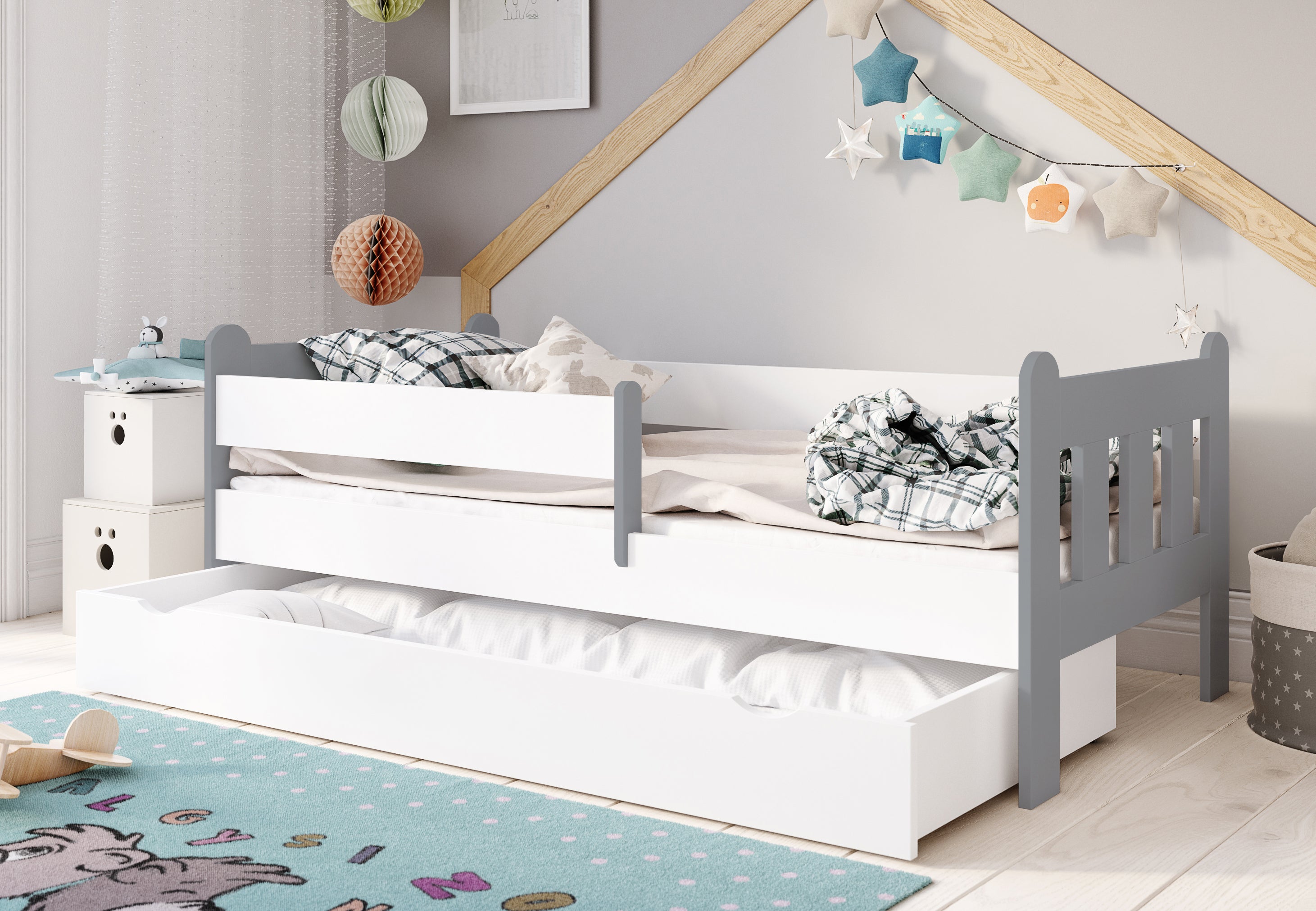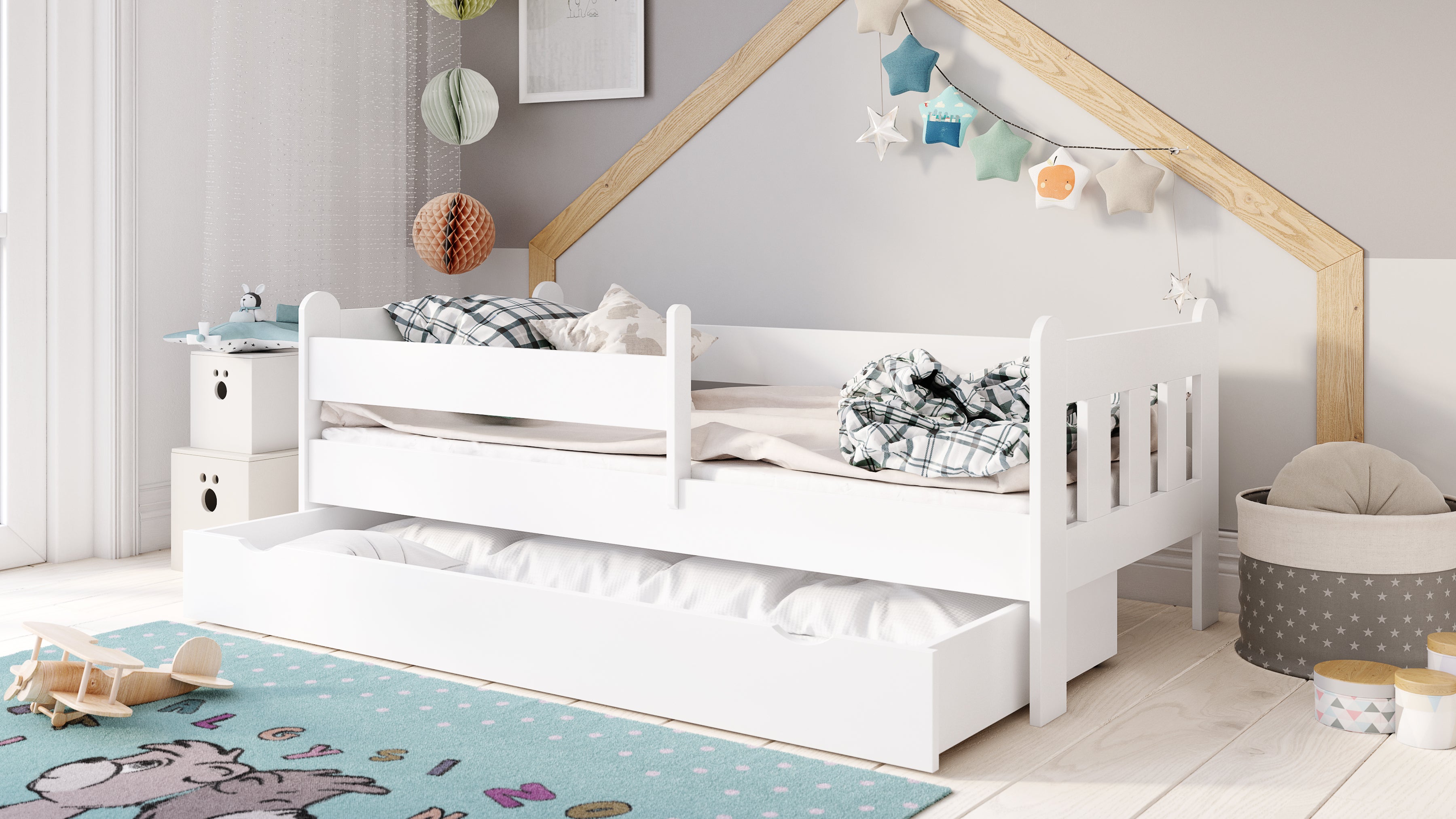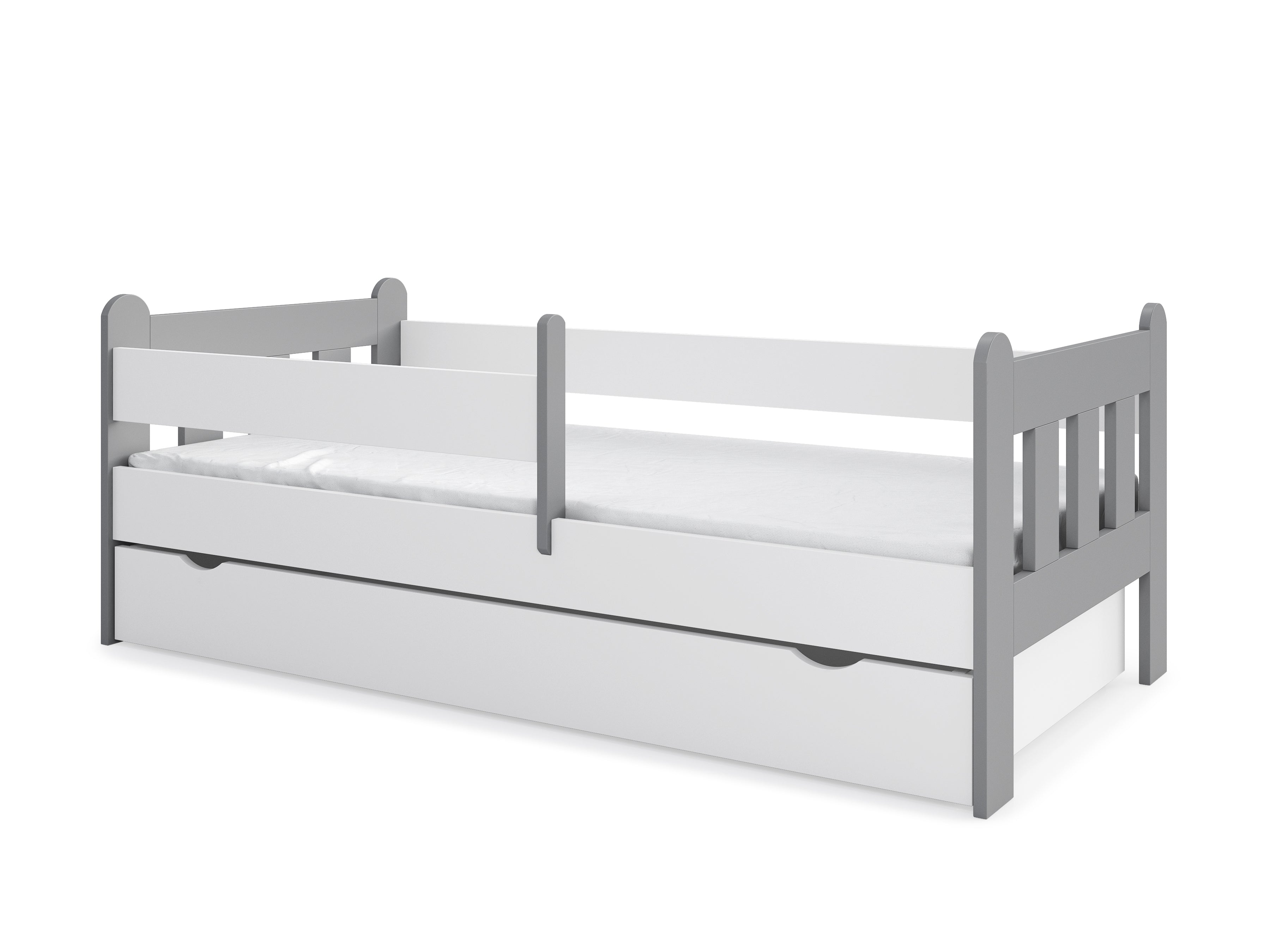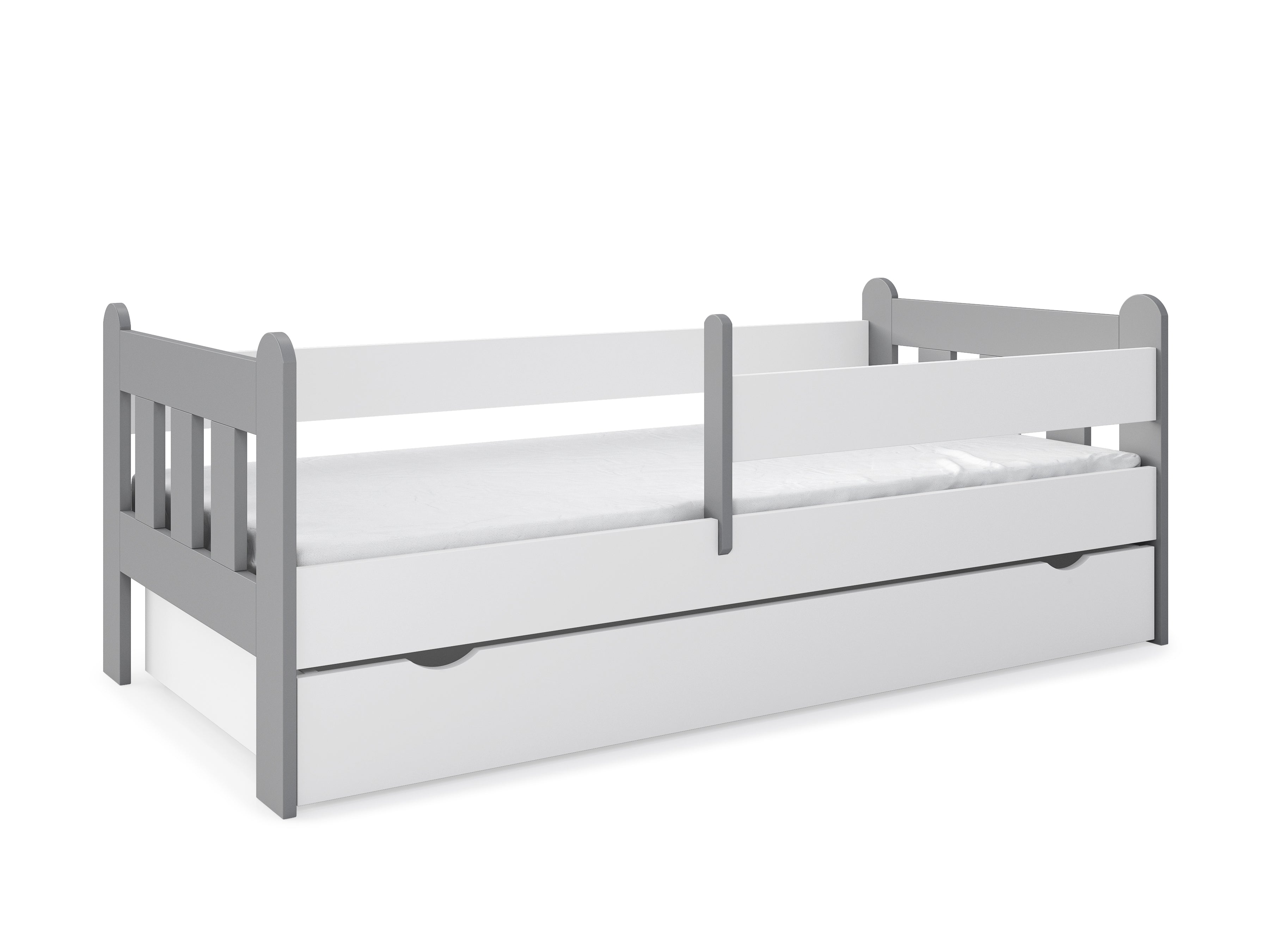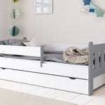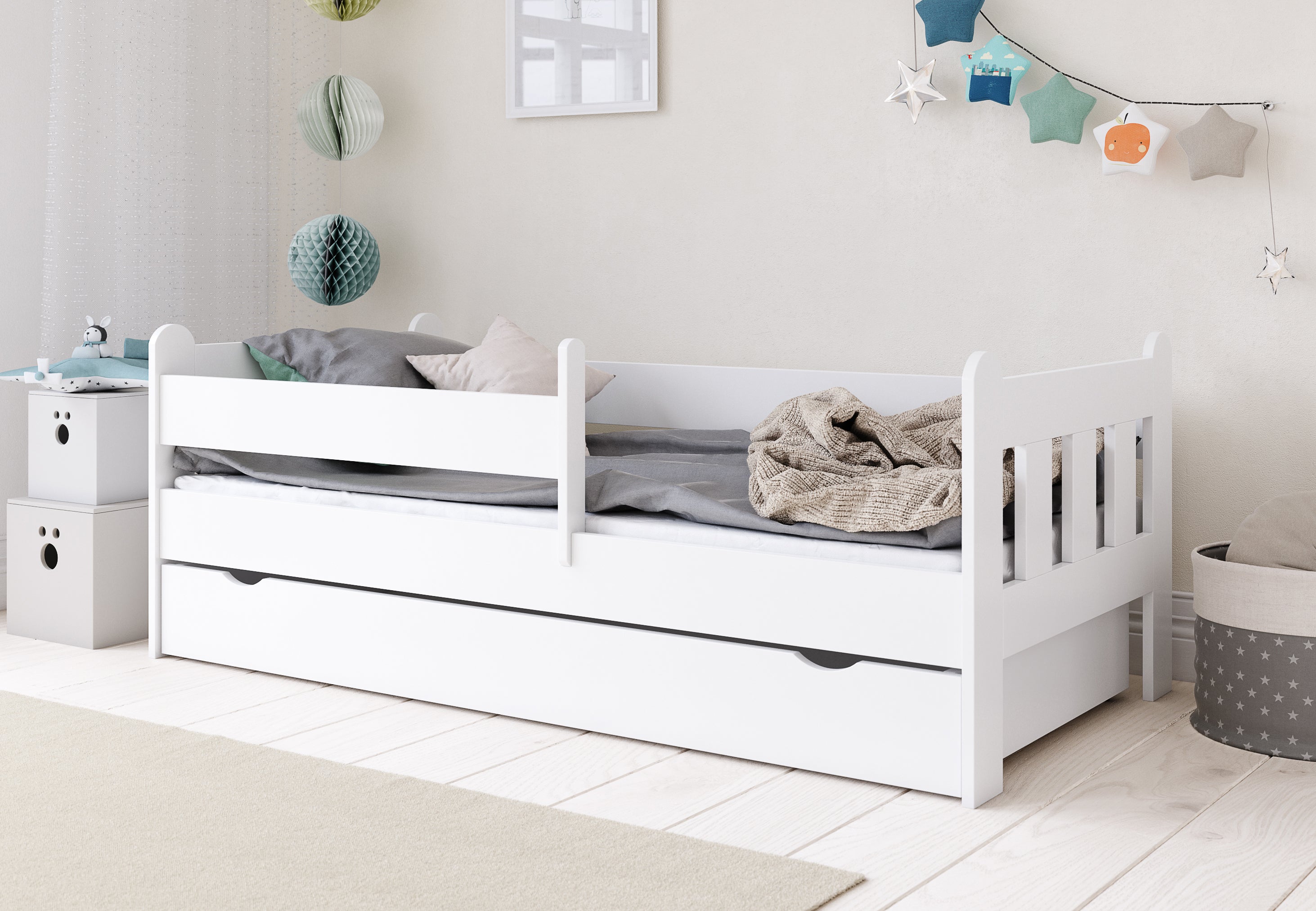 Dieses hochwertige Kinderbett steht für Qualität, Stabilität und Sicherheit für Ihr Kind. Für optimale Sicherheit sorgt die beidseitig anbringbare Sicherheitsbarriere, sodass auch beim Toben oder nächtlichen Träumen nichts passieren kann. Die integrierte Schublade bietet Extra-Stauraum für Bettdecken, Kissen, oder Spielzeuge. Ein stabiles Lattenrost ist im Lieferumfang enthalten.