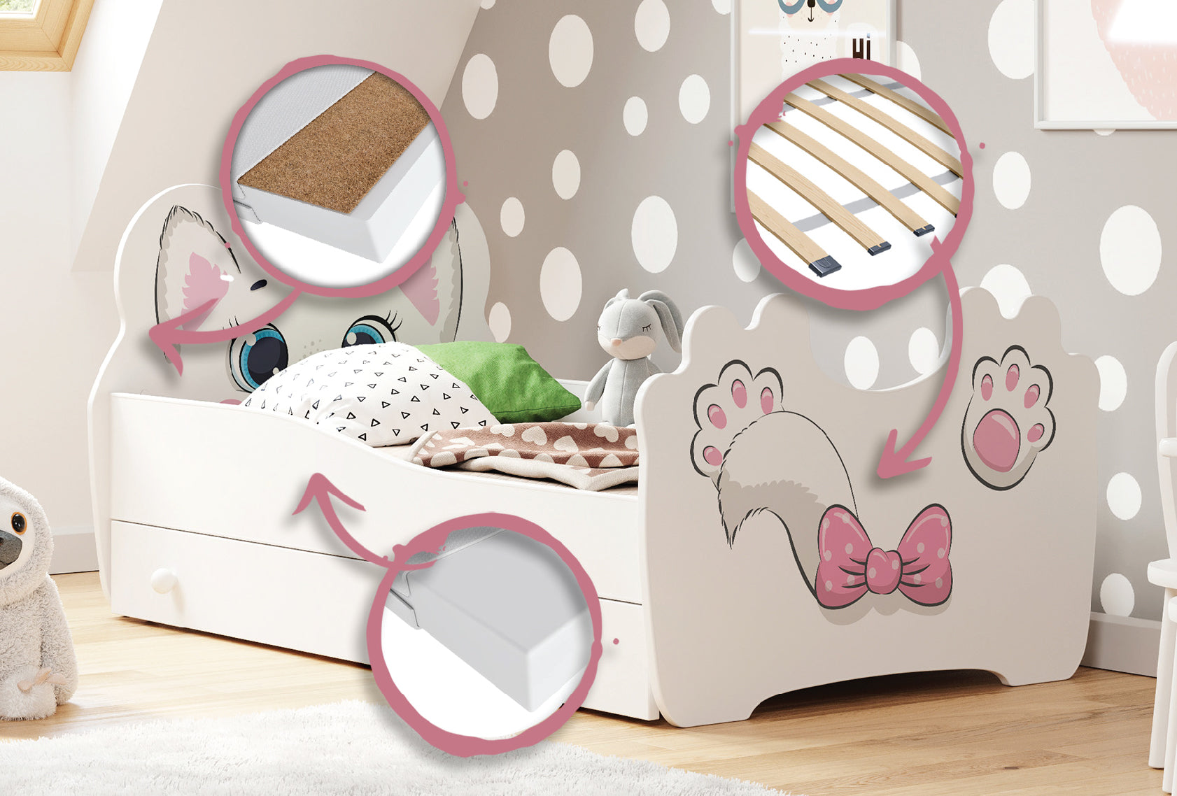 Katzen-Motiv | MDF-Holz | Mit Schublade & Lattenrost | 70–80 × 140–160 cm